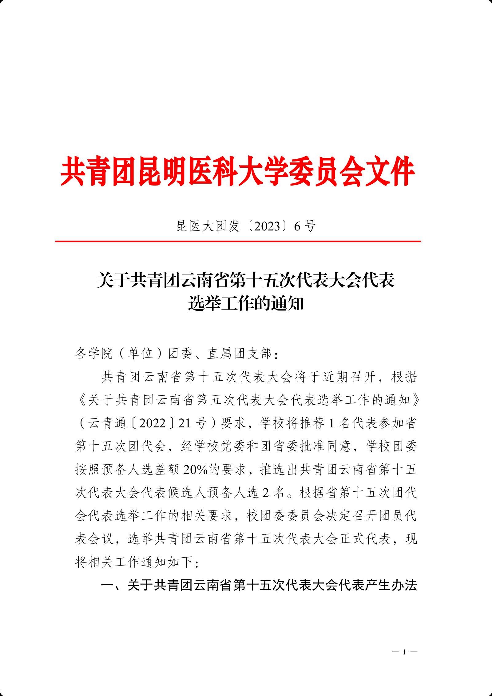 关于共青团云南省第十五次代表大会代表选举工作的通知