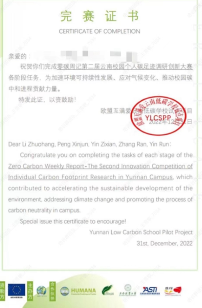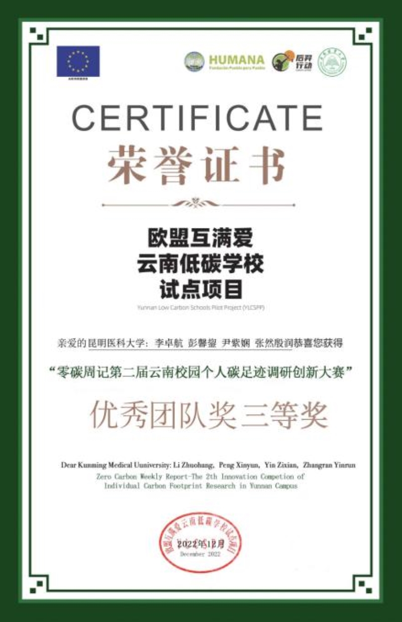 为进一步落实《云南省创建生态文明建设排头兵促进条例》,促进实现云南省碳达峰碳中和目标,争当“生态文明排头兵”,培养我校学生科学分析思维,通过落地活动锻炼组织协调能力,通过培训了解气候变化及碳足迹知识,并通过分析报告的撰写,思考个人碳减排路径,从而倡导同学采取行动实现个人碳减排,2022年10月20日-12月31日,伟德国际1949官网学生生态健康科普协会举办了2022年校园个人碳足迹碳排放调研创新大赛暨第二届云南省赛选拔赛。伟德国际1949官网获得了“优秀组织奖”,团队获得了“优秀团队三等奖”。本次活动有5000人在“第二课堂”抢票,有201支队伍报名参加协会大赛,有99支队伍报名参加省赛,协会对获奖的31支队伍及139名个人予以表彰。此次校园个人碳足迹碳排放调研创新大赛历时两个多月,很大程度上提高了参与者和调研对象节能减排的环保意识,并将理论落于实践,共同携手促进实现云南省碳达峰碳中和。