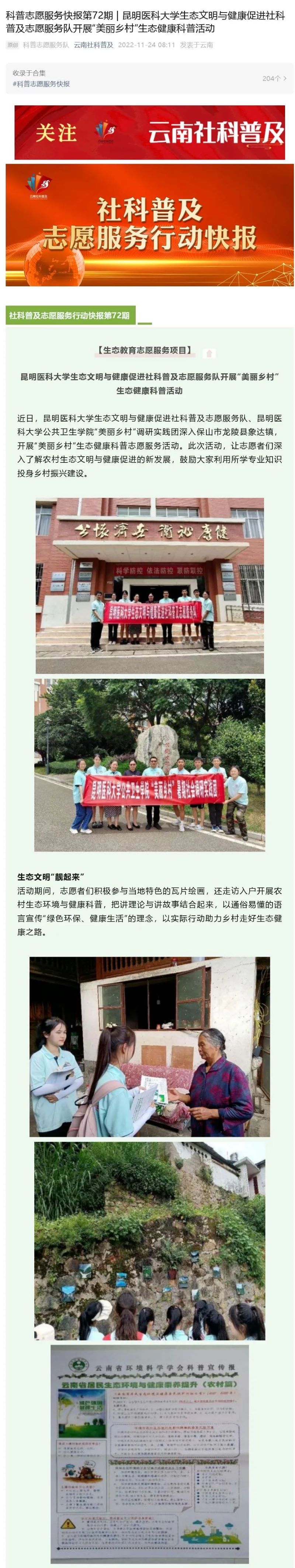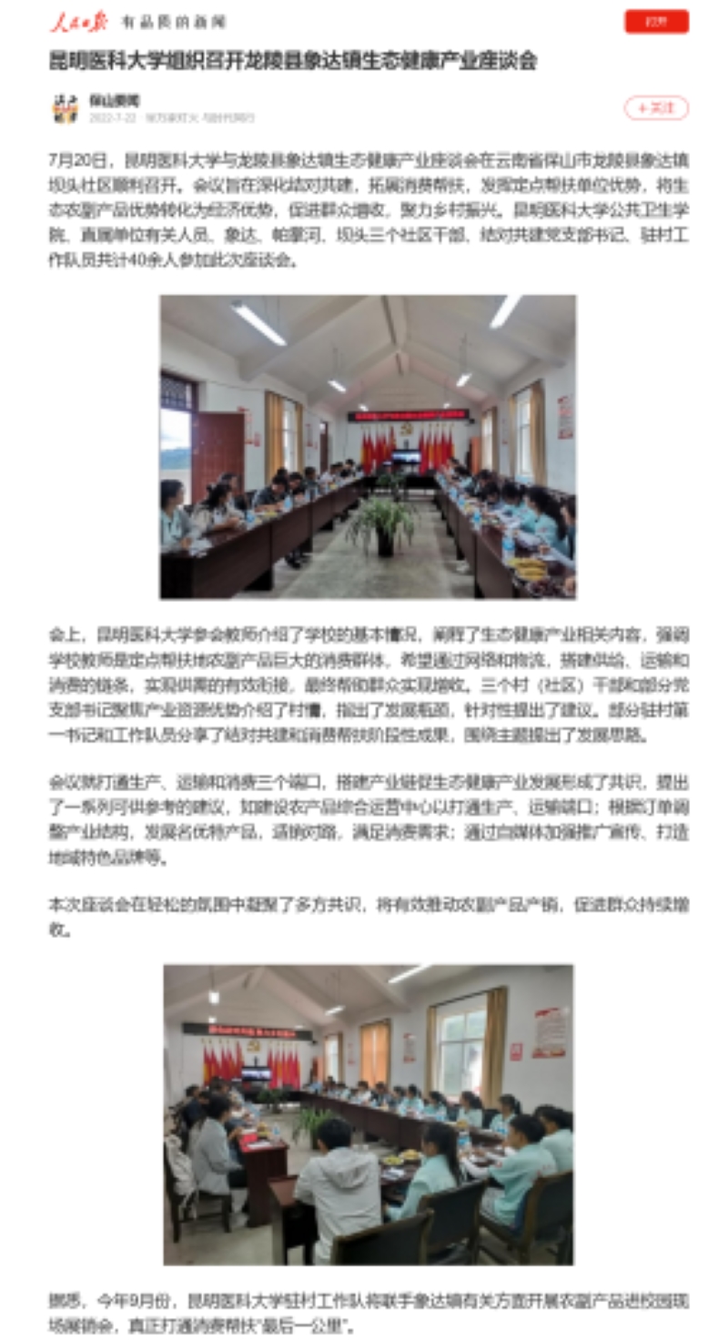 省社科联的科普志愿服务快报第72期作了专题报道:伟德国际1949官网生态文明与健康促进社科普及志愿服务队开展“美丽乡村”生态健康科普活动。《人民日报》保山要闻、《人民日报》滇西视觉对“美丽乡村”调研实践团、驻村干部联合组织召开的龙陵县象达镇生态健康产业座谈会进行报道。