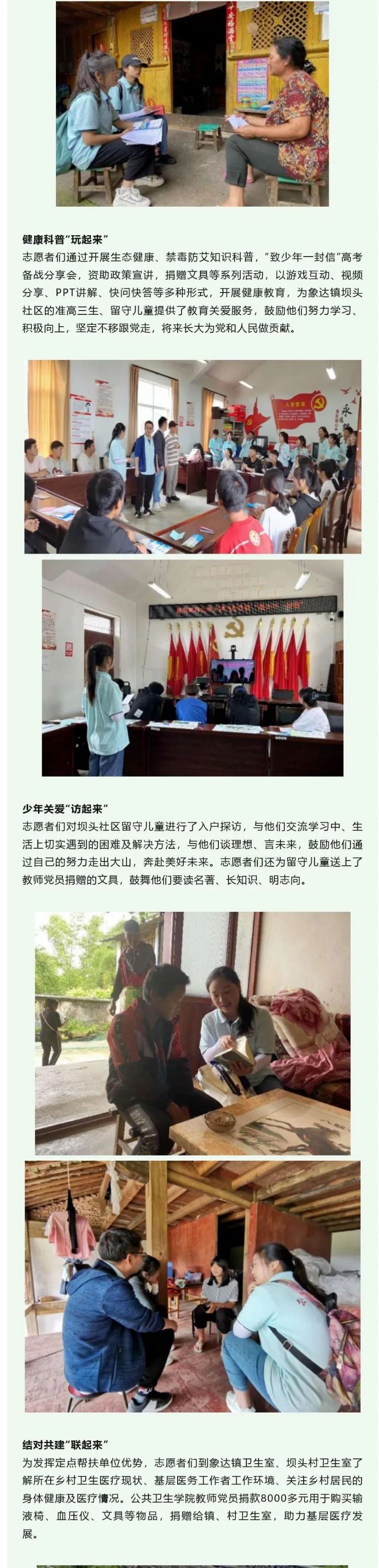 2022年暑期“生态科普社会实践”特色活动中,546人参与了本活动,评选出了9个优秀团队、54名优秀志愿者。2022年7月18日—21日,我校公共卫生学院“美丽乡村”调研实践团赴龙陵象达镇开展生态健康科普志愿服务和暑期社会实践。伟德国际1949官网生态文明与健康促进社科普及志愿服务队、伟德国际1949官网公共卫生学院“美丽乡村”调研实践团深入保山市龙陵县象达镇,围绕“生态美”“健康美”“产业美”“少年美”“风俗美”“红色美”“共建美”“驻村美”这八美走村入户,实地考察调研美丽乡村建设情况,深入了解农村生态文明与健康促进的新发展,鼓励同学们利用所学专业知识投身乡村振兴建设,为美丽乡村建设贡献智慧。