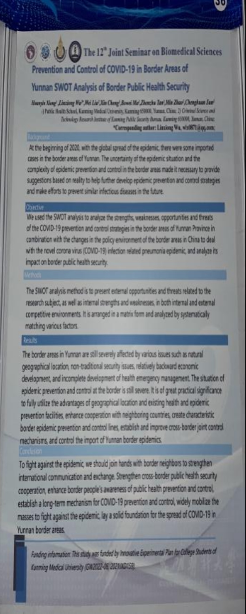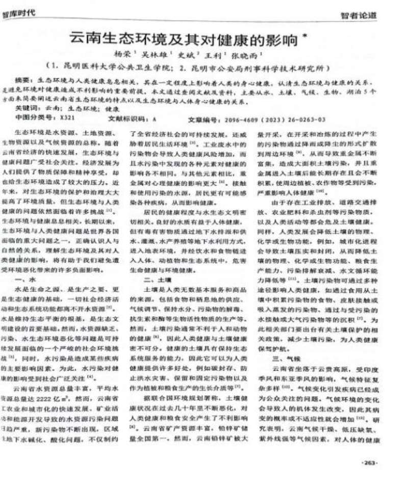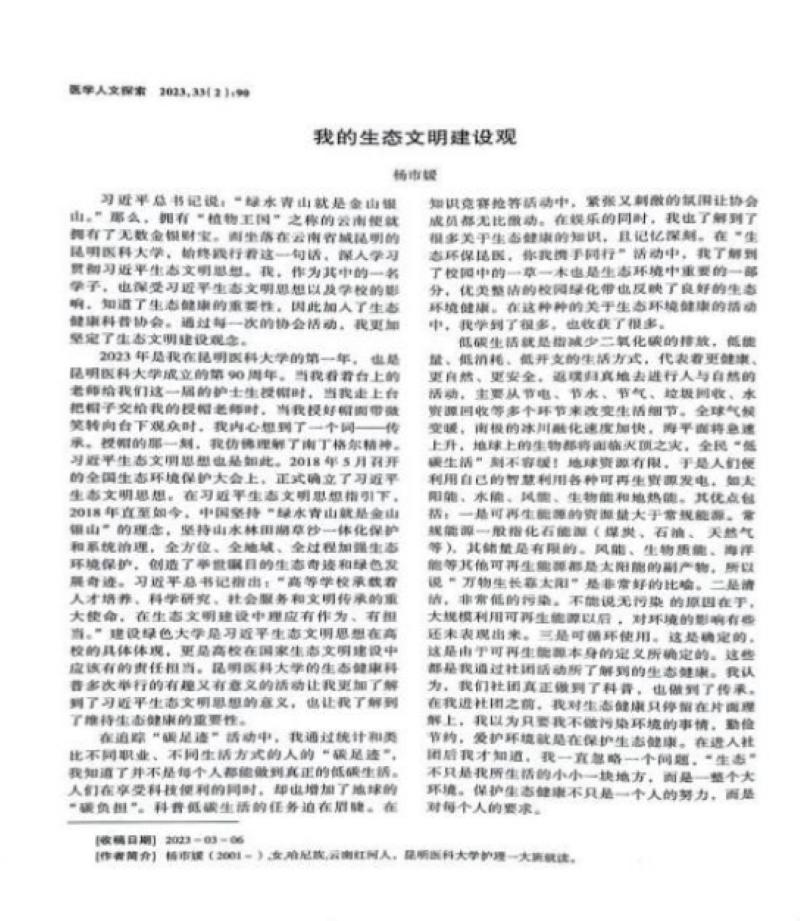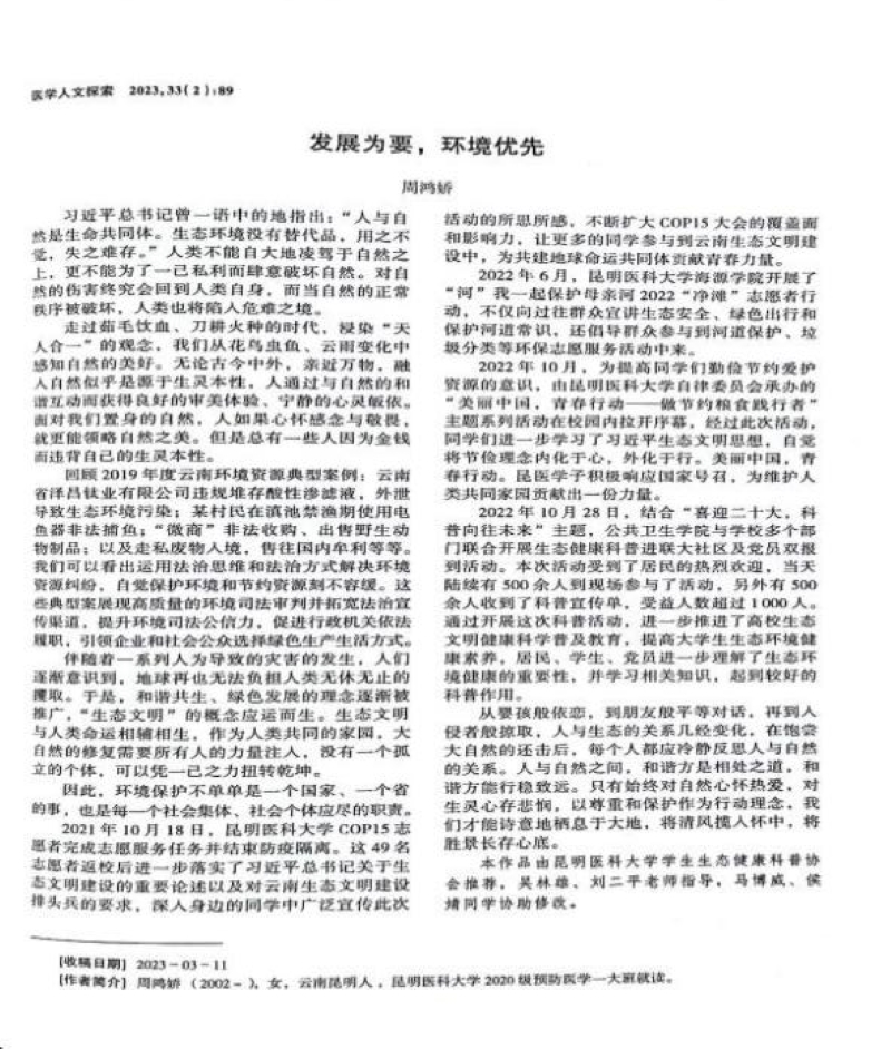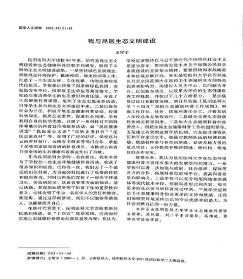 协会加强会员的科学研究和科普,发表论文4篇,其中智库时代1篇,医学人文探索3篇;第十二届“三国四校”生物医学研讨会论文集收录4篇、壁报展示4篇;2023年云南省环境科学学会年会干部周鸿娇代表协会研讨交流发言。
