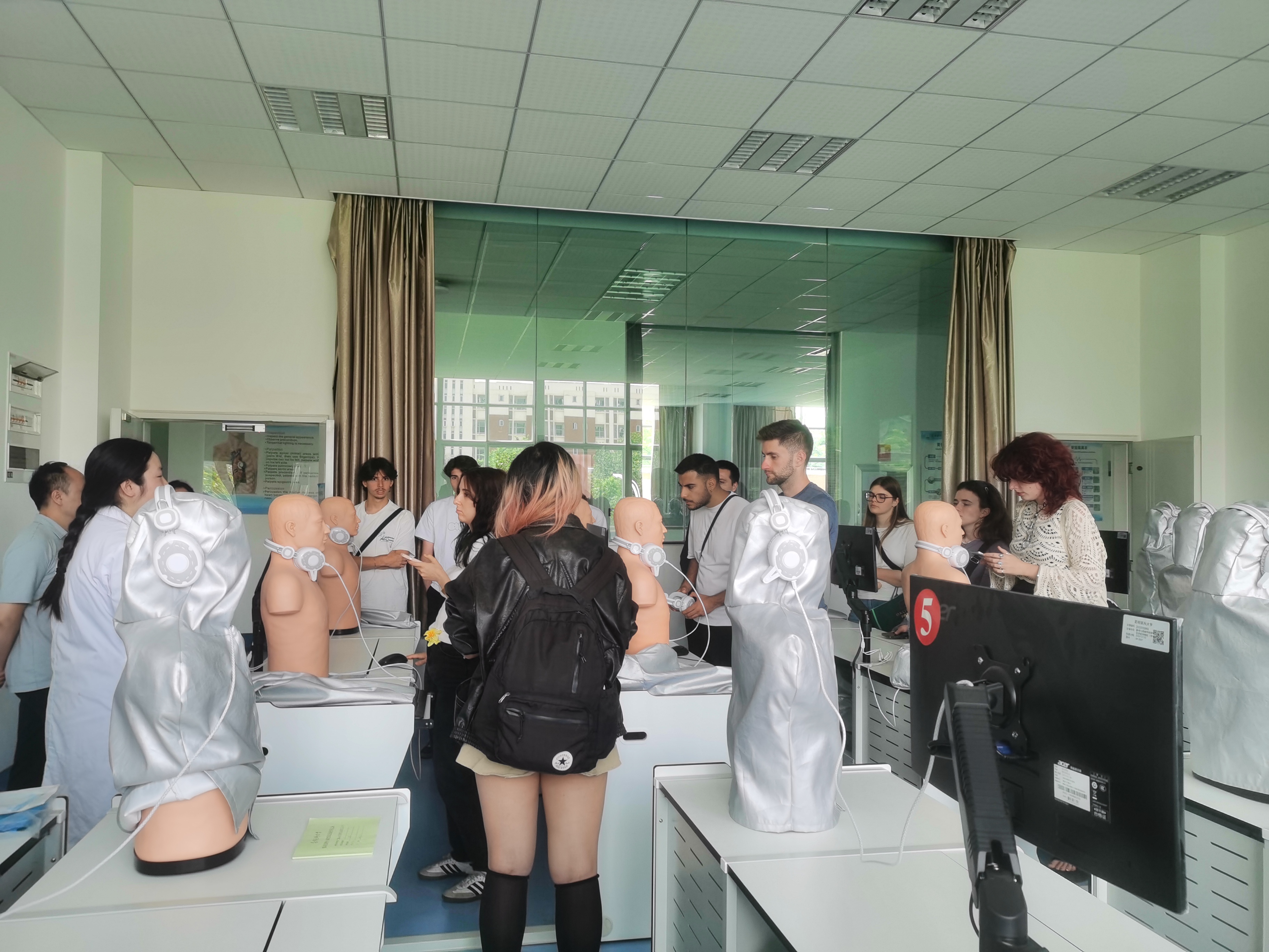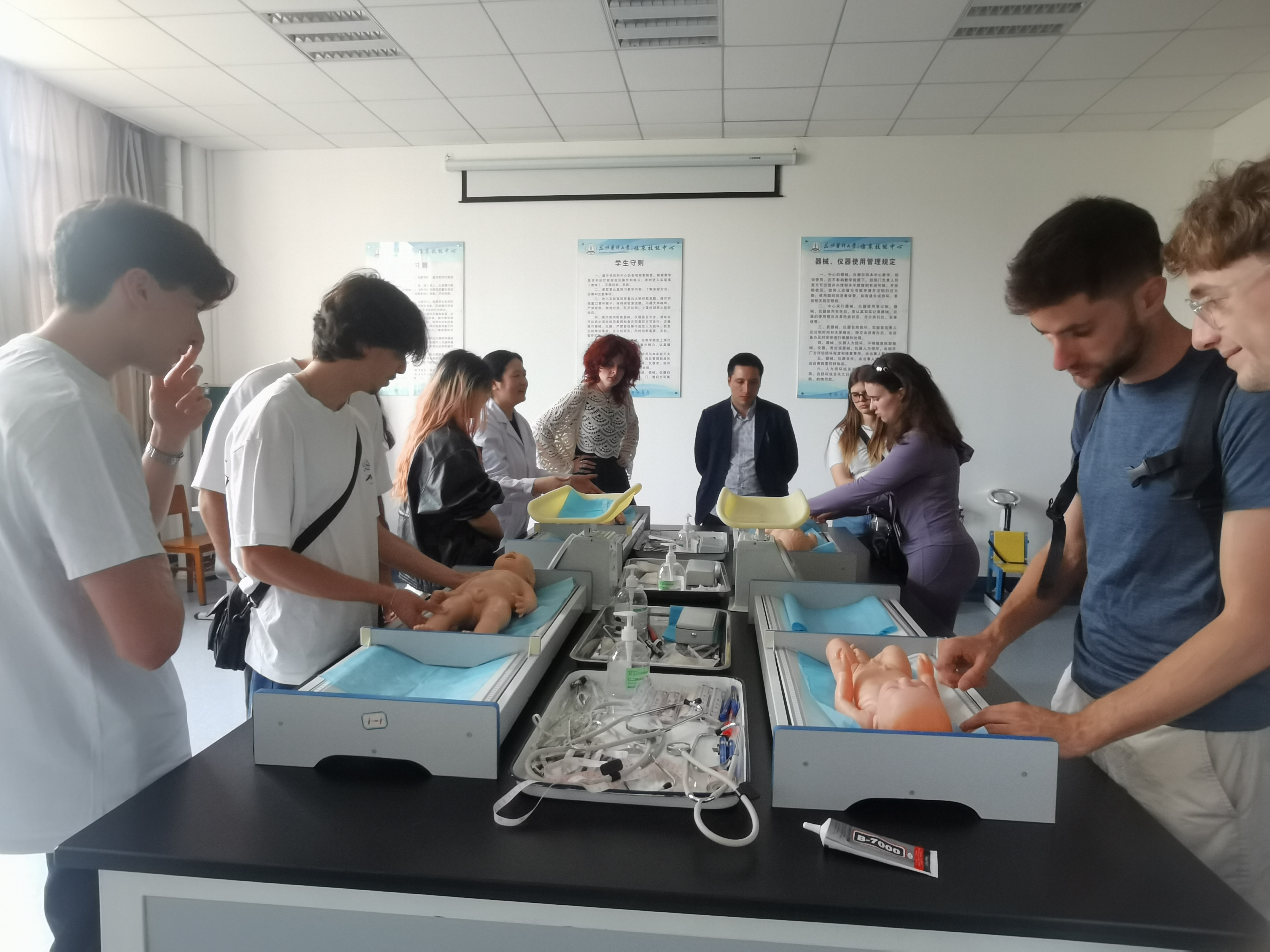 7月11日下午,法国洛林大学南锡医学院学生团组到中心参观交流。中心教师详细介绍了中心的各个功能区、模拟教学设备并指导来访学生体验了急救基本操作。