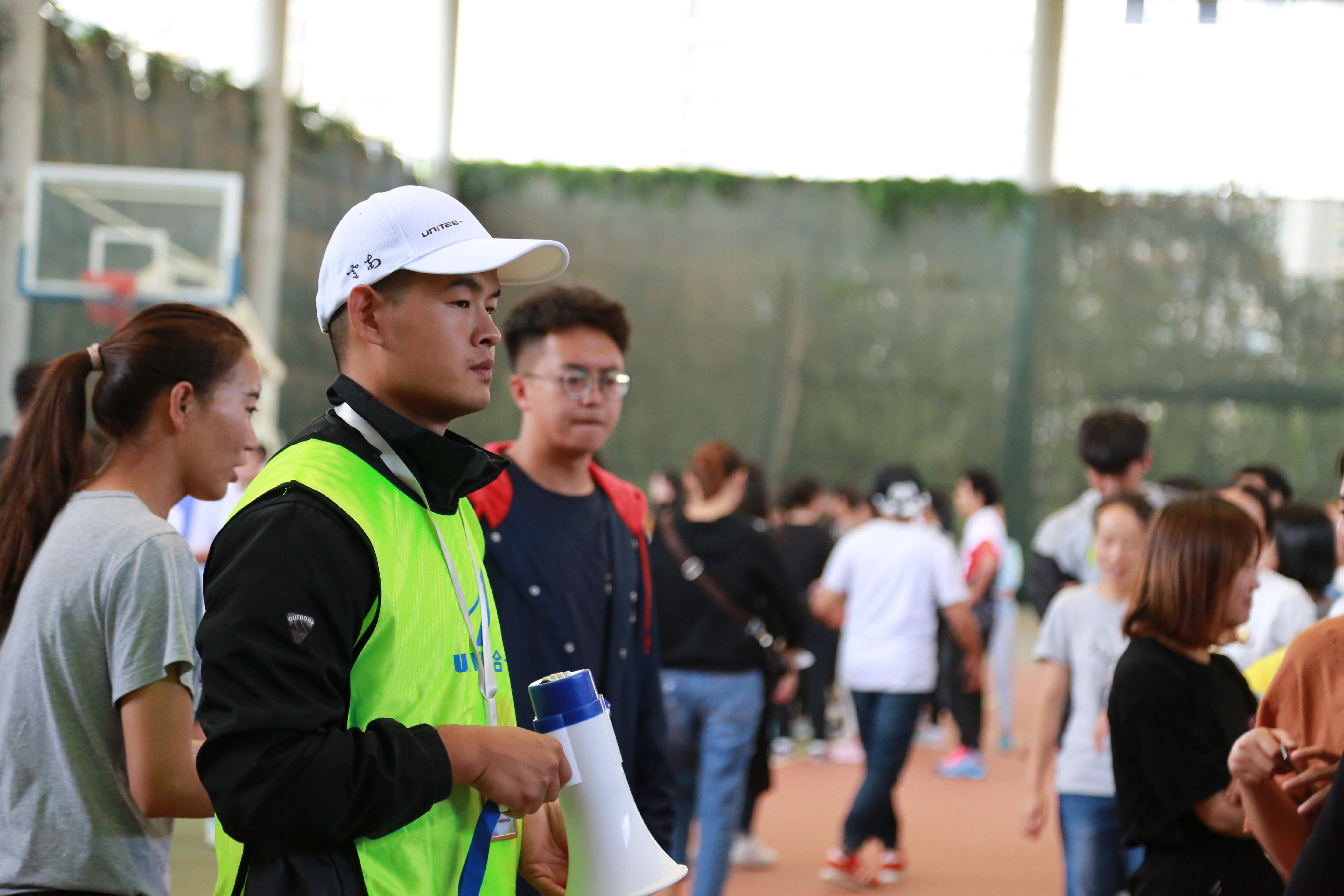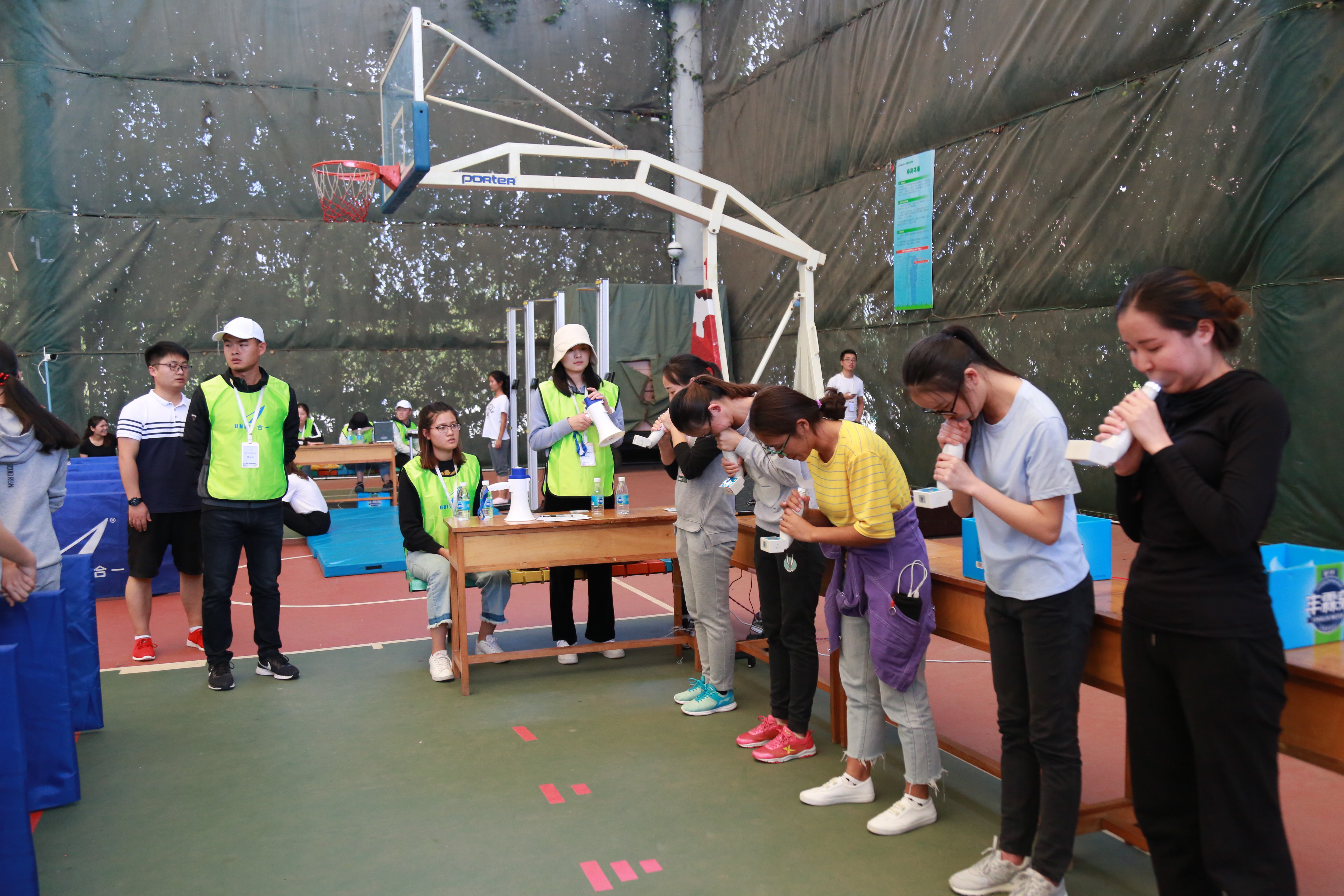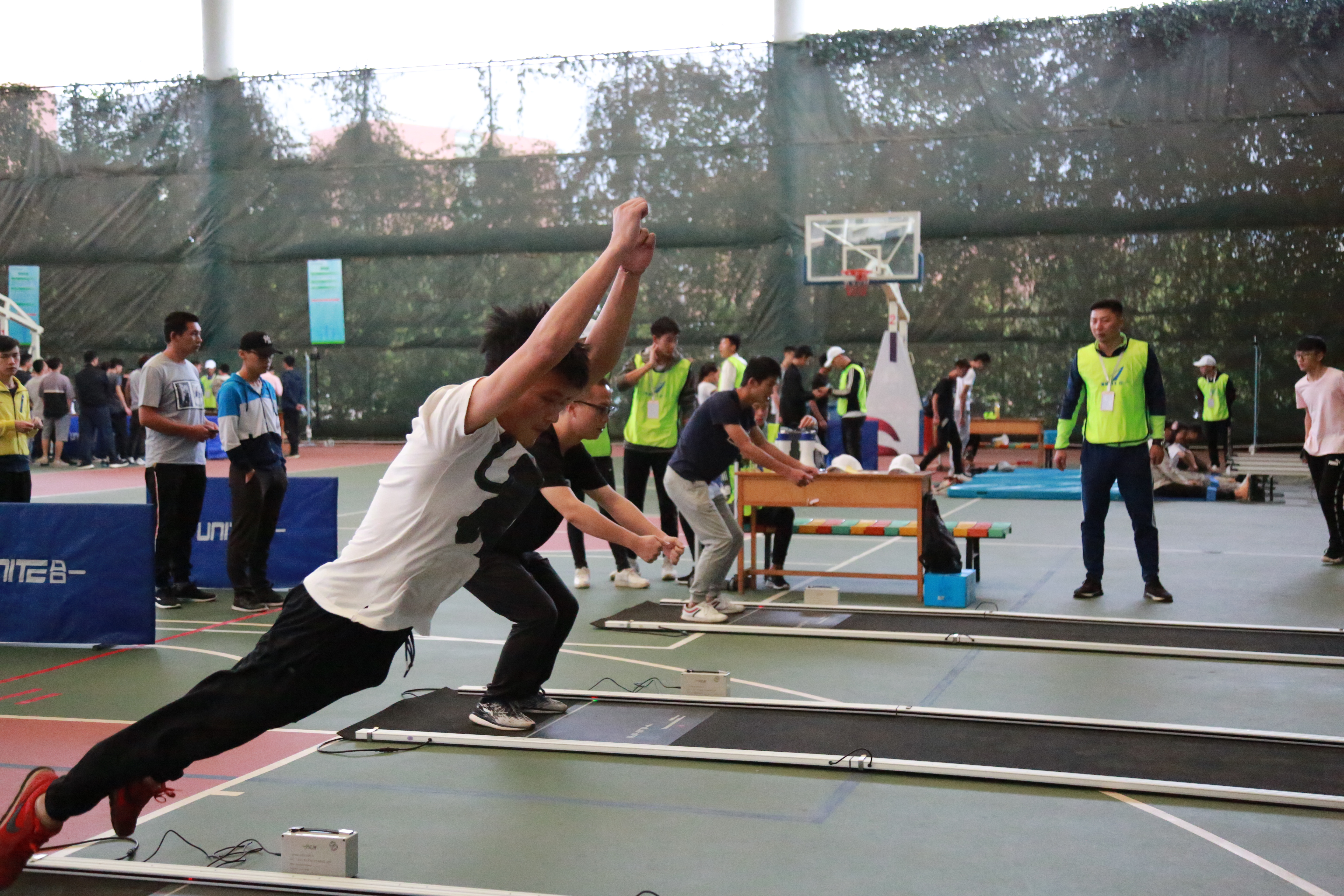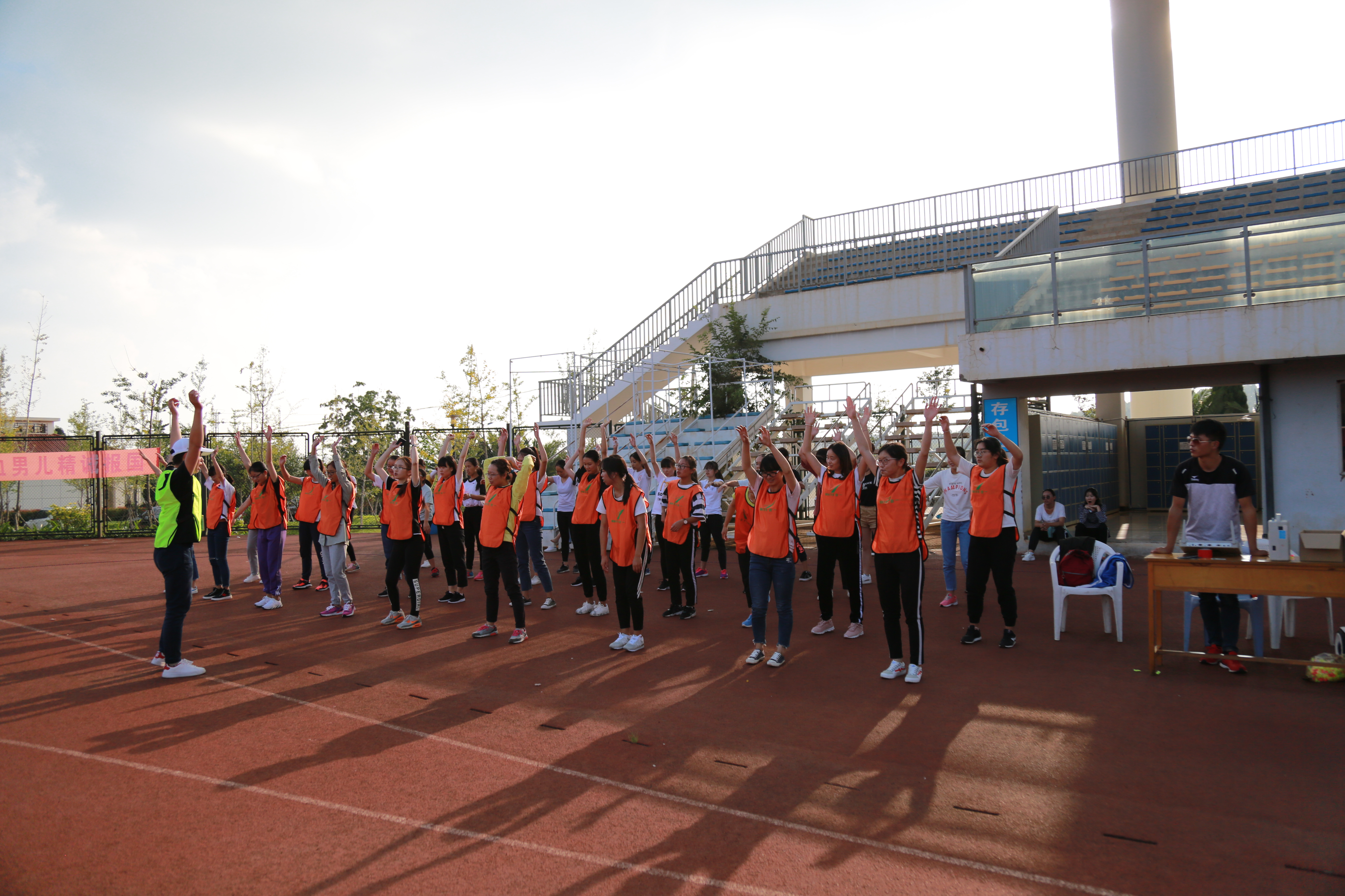 上午9点,学生集合整队、佩戴号码簿、上交证件,在体育老师的指导下,认真完成测试前的各项热身动作。