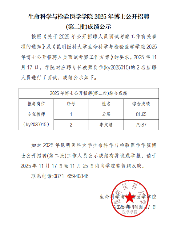 生命科学与检验医学学院2025年博士公开招聘(第二批)成绩公示