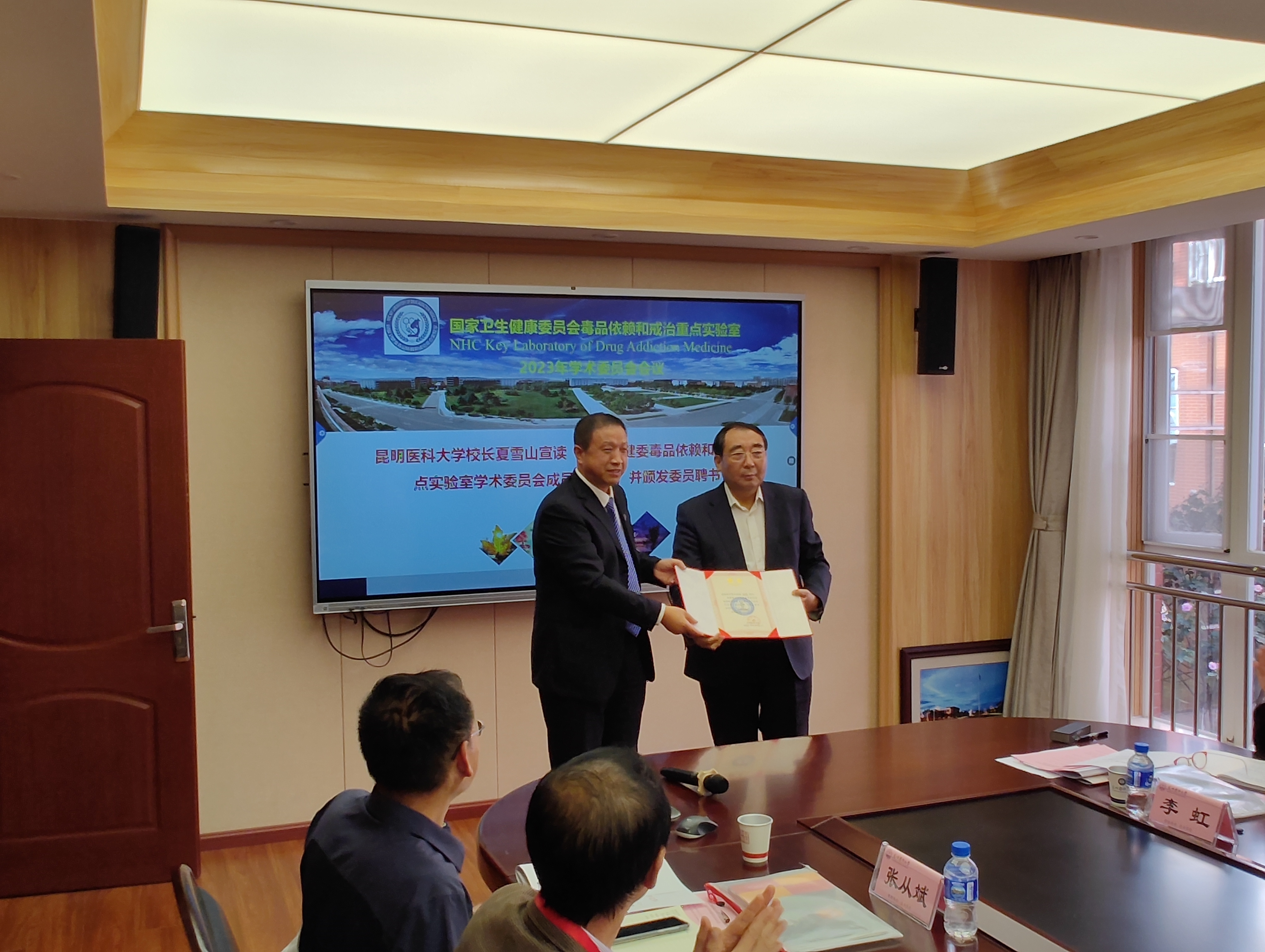 夏雪山指出毒品问题既关系到公共安全,也关系到人民生命健康。云南特殊的时空环境,导致毒品及毒品相关问题尤为突出,已成为制约云南高质量跨越式发展的因素之一。伟德国际1949官网在毒品依赖与戒治领域有一定的基础,并具有显著的区域特色,在此基础上2019年获批立项建设国家卫生健康委重点实验室。经过4年的建设,取得一定的成效,但也还有需要进一步提升的空间。此次召开由丛斌院士领衔的学术委员会会议,由衷希望各位委员对重点实验室的建设发展进行问诊把脉,指明方向,为把实验室建设成为特色明显,区域领先的国家部委实验室建言献策。夏雪山同时为各位委员颁发了聘书。
