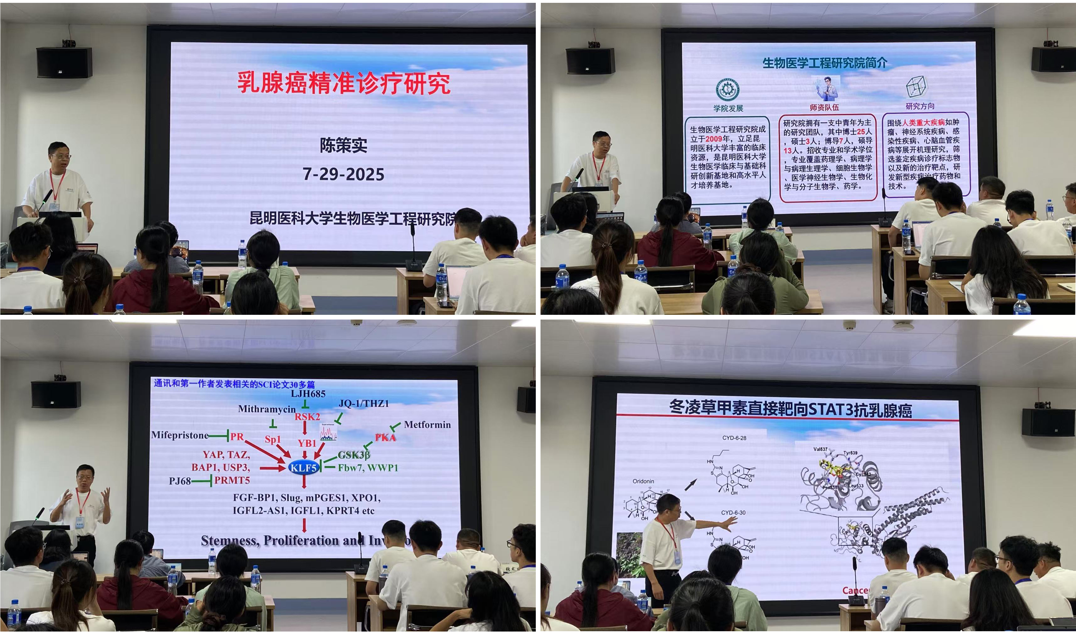 2025年7月29日,伟德国际1949官网2025年优秀大学生夏令营的同学们来到伟德国际1949官网生物医学工程研究院开展学习与参观活动。陈策实院长从研究院的发展历程、师资队伍、研究方向、科研平台以及科研项目等方面,详细介绍了研究院的基本情况。随后,陈策实院长以课题组在乳腺癌发病机制及免疫逃逸、化疗耐药领域的最新研究为例,围绕转录因子KLF5的调控作用进行科普讲解,用通俗易懂的语言让营员们深入了解了团队在乳腺癌发病机制、动物模型及治疗药物研究方面取得的系列成果。