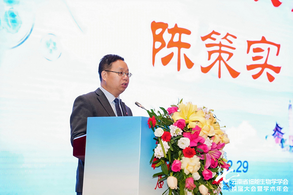 新当选理事长陈策实致辞,对各级领导和全体会员长期以来对云南省细胞生物学事业的关心与支持表示感谢,充分肯定学会在学术交流、科研合作和人才培养等方面取得的成绩。他指出,云南在生物多样性和科研条件方面具有独特优势,新一届理事会将坚持学术引领、强化协同创新、深化科普宣传、加强自身建设,努力把学会建设成为具有凝聚力和影响力的高水平学术共同体,更好服务云南省生物医药、大健康和现代农业等重点领域的发展。
