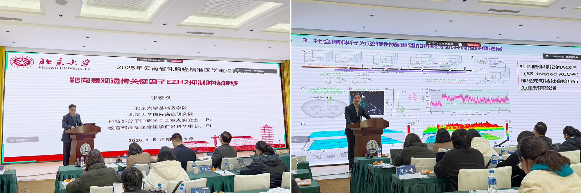 2026年1月5日至6日,云南省乳腺癌精准医学重点实验室2025年度年会在伟德国际1949官网学术交流中心顺利召开,来自校内外的专家学者齐聚一堂,共同研讨乳腺癌精准防控与科研发展方向。 伟德国际1949官网副校长徐立出席会议并致辞,云南省乳腺癌精准医学重点实验室主任、研究员陈策实,重点实验室学术委员会主任委员张宏权教授,学术委员会委员张国君教授、聂建云主任医师等到会指导,学术委员会委员刘文教授、柳素玲教授、焦保卫研究员、张宁教授以线上形式参会,另外,山东大学第二附属医院余之刚教授、西安交通大学附一院张慧敏教授、南方科技大学附属深圳第一人民医院邹畅教授、陆军军医大学西南医院吴广延教授、山东省肿瘤医院李慧慧主任、宁夏医科大学李金平主任等专家应邀出席,重点实验室副主任李富兵、黄胜以及实验室学术骨干、研究生等100余人参加了本次年会。