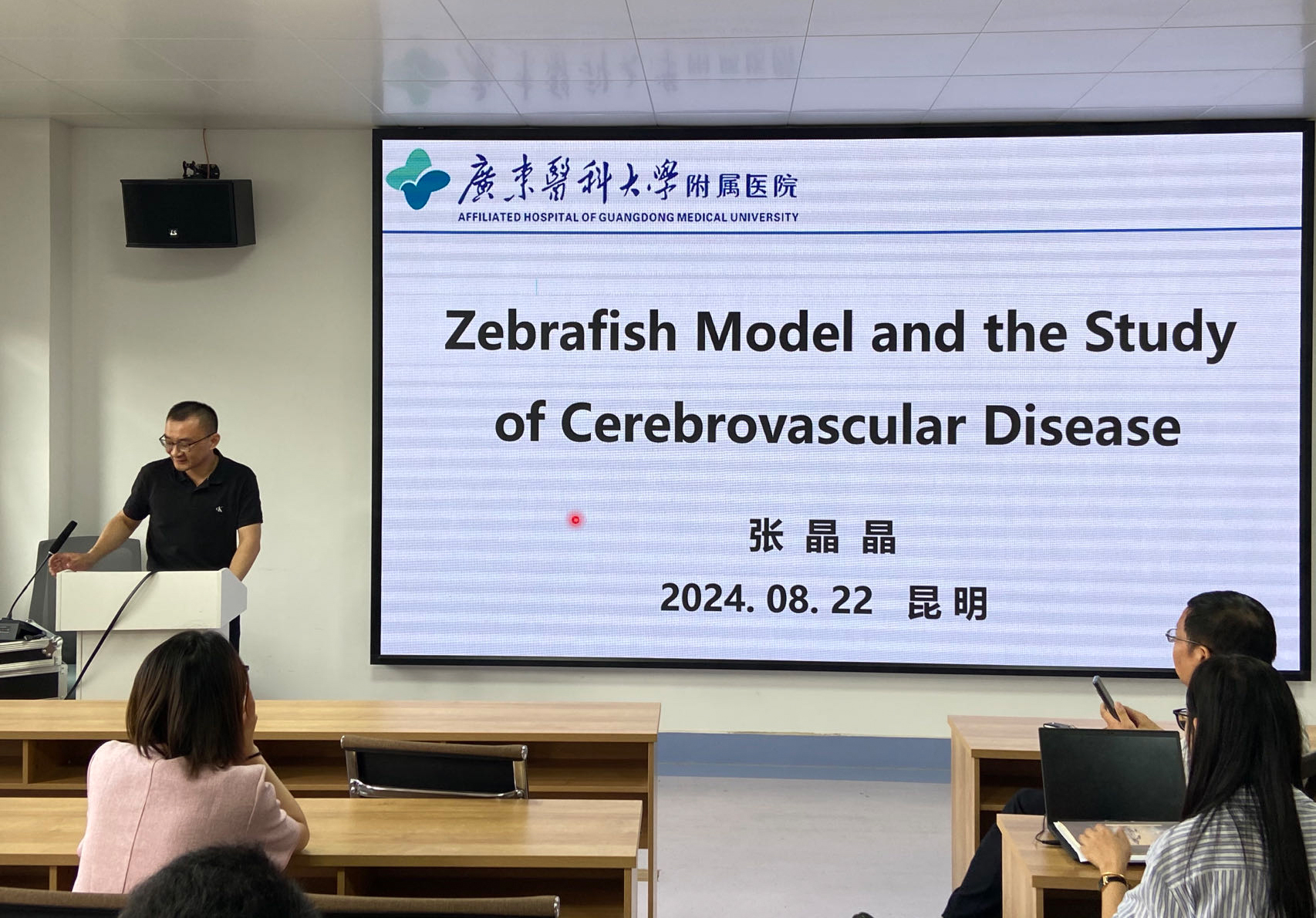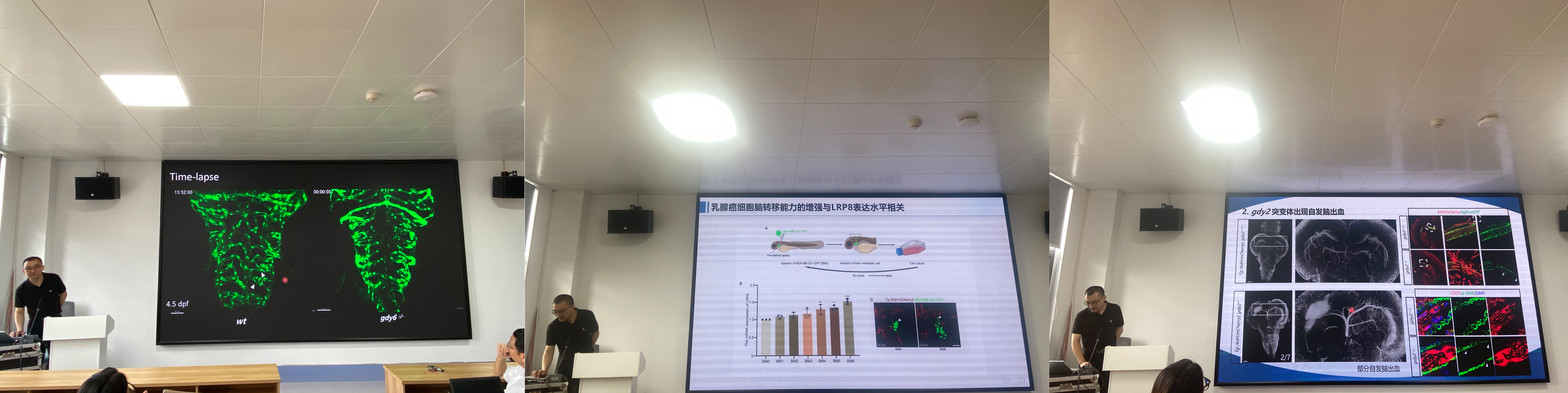 在交流会上,张晶晶教授以“Zebrafish model and the study of cerebrovascular disease”为主题,介绍了课题组以斑马鱼为研究对象,在脑血管(血脑屏障)发育与功能维持研究、遗传性脑血管疾病模型建立和调控机制研究,以及斑马鱼乳腺癌脑转移模型的建立等方面的研究进展。