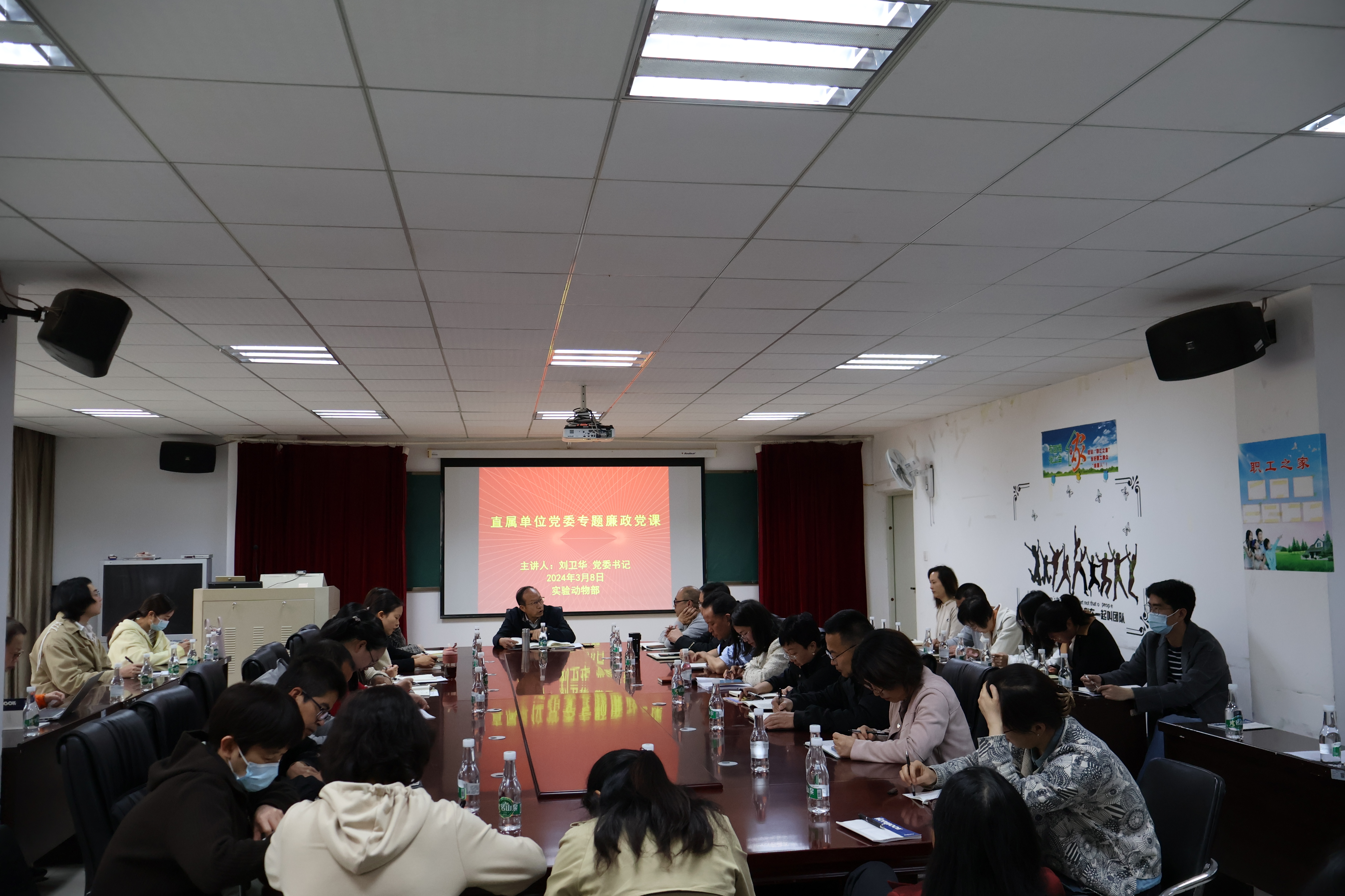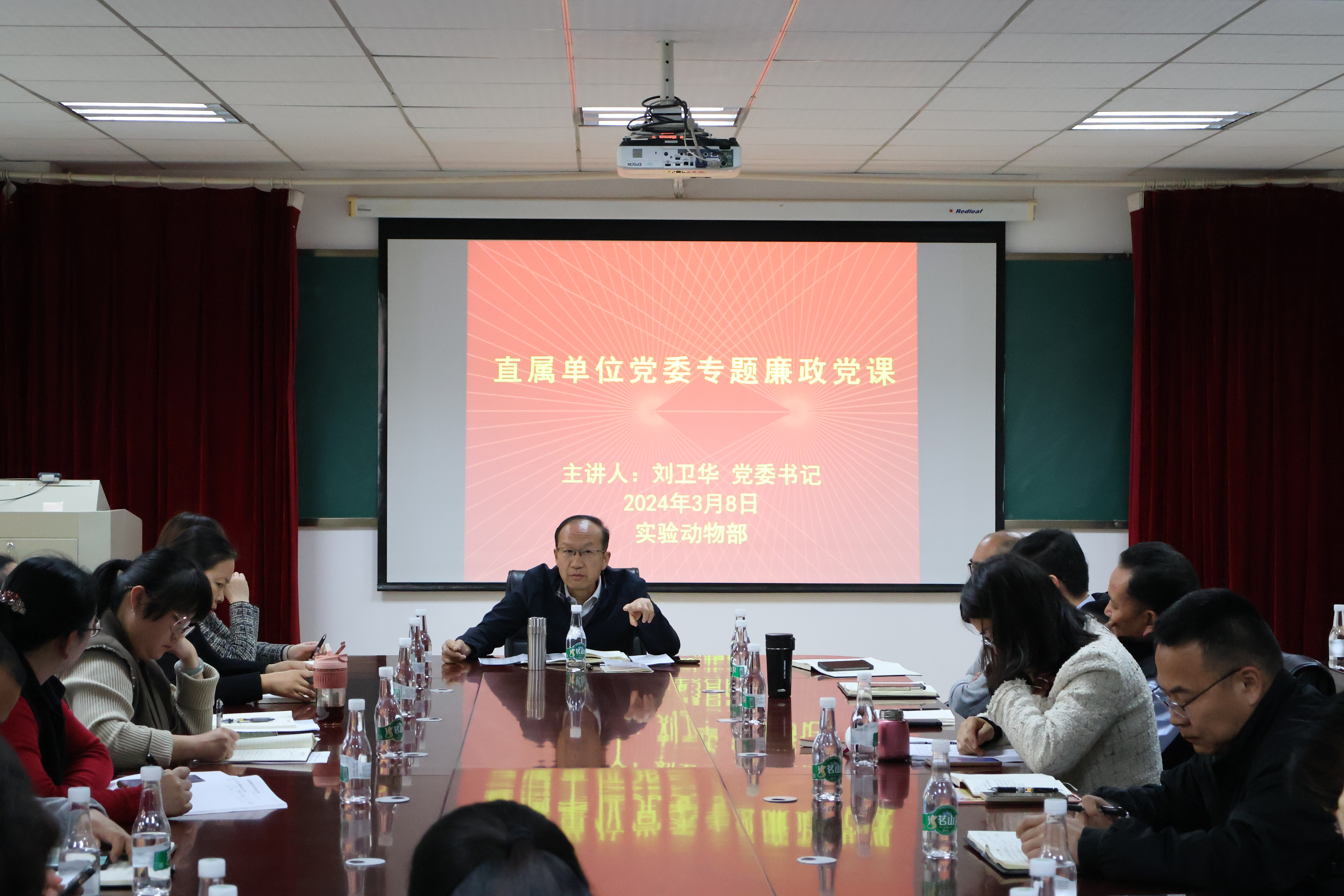 2024年3月8日,直属单位党委刘卫华书记在实验动物学部1号楼(SPF楼)101会议室讲授专题廉政党课,直属各单位科级干部以及实验动物学部全体党员参加了此次专题廉政党课学习。