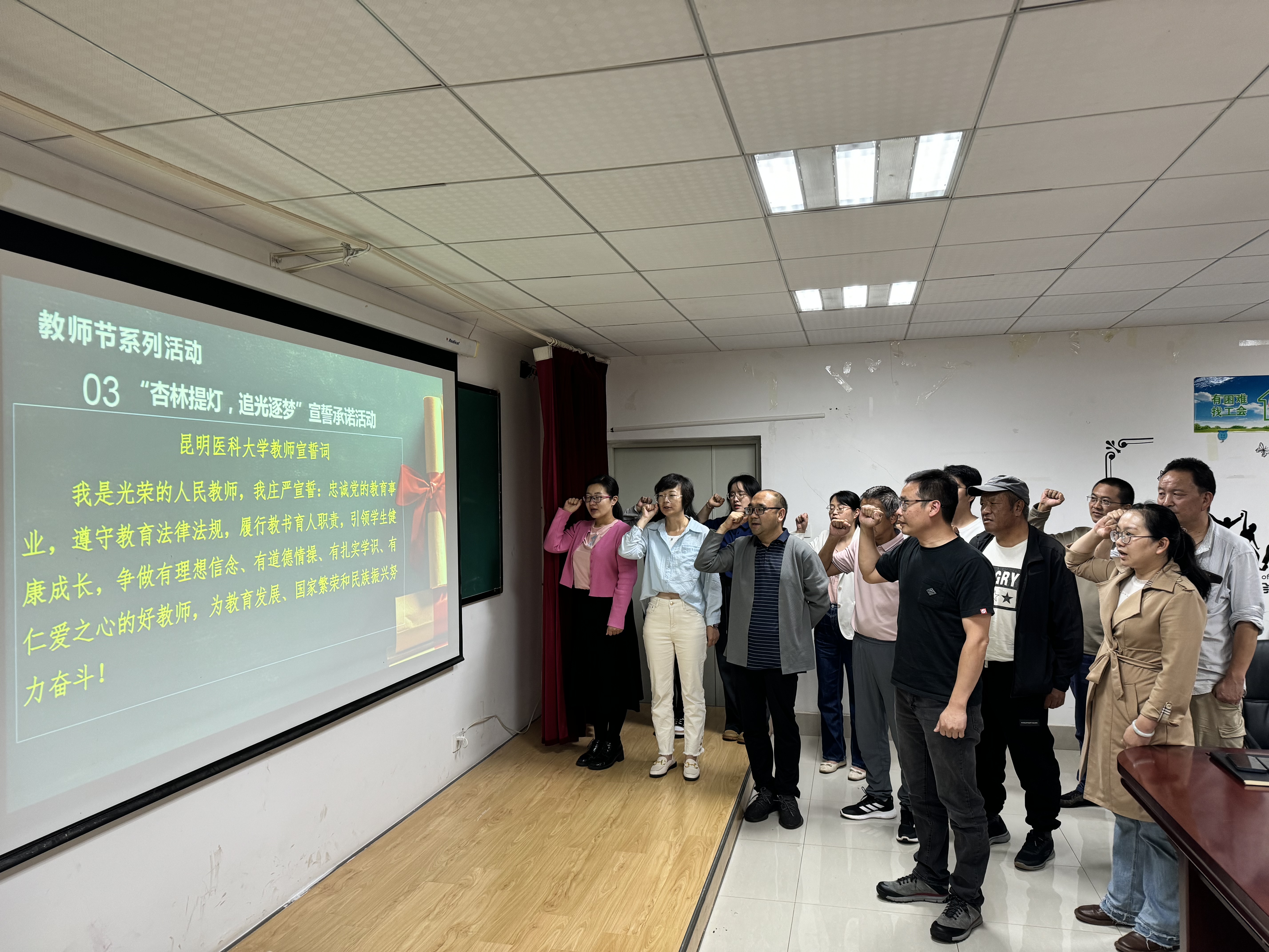 学部赵洪波副主任带领全体教职工举行“伟德国际1949官网教师宣誓词”宣誓活动。此外,学部全体教职工签署了《伟德国际1949官网教师师德承诺书》。支部书记张兰春同志代表支部向全体教职工致以节日祝福,并为到场教职工献花,充分肯定教职工的辛勤活动。