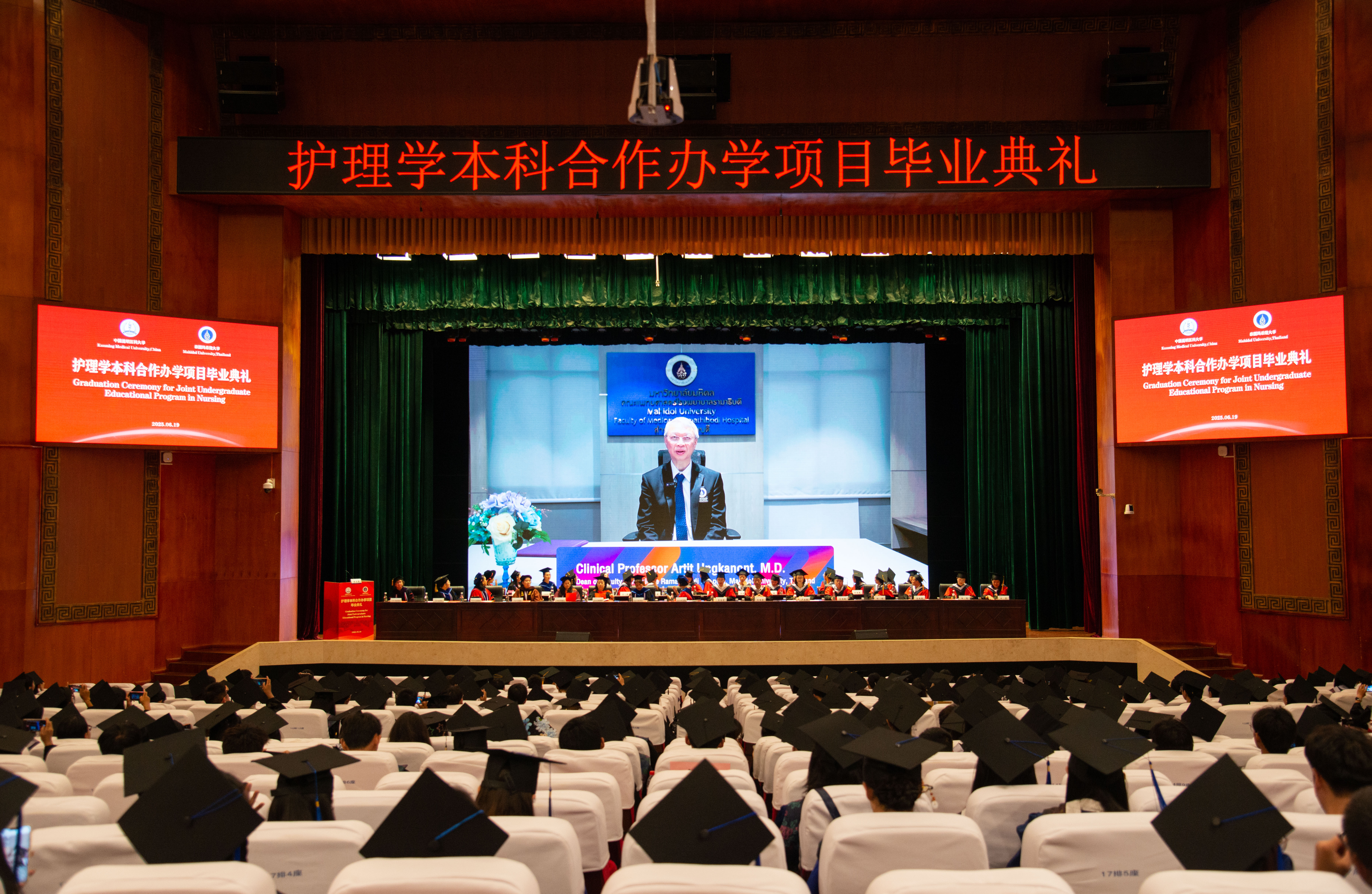 泰国玛希隆大学拉玛提博迪医院院长Artit Ungkanont通过视频向毕业生们送上祝福。他表示,2025届学子以卓越表现书写了这一重要项目的开篇华章,他衷心祝愿毕业生们在未来的职业道路上再创佳绩,鹏程万里。