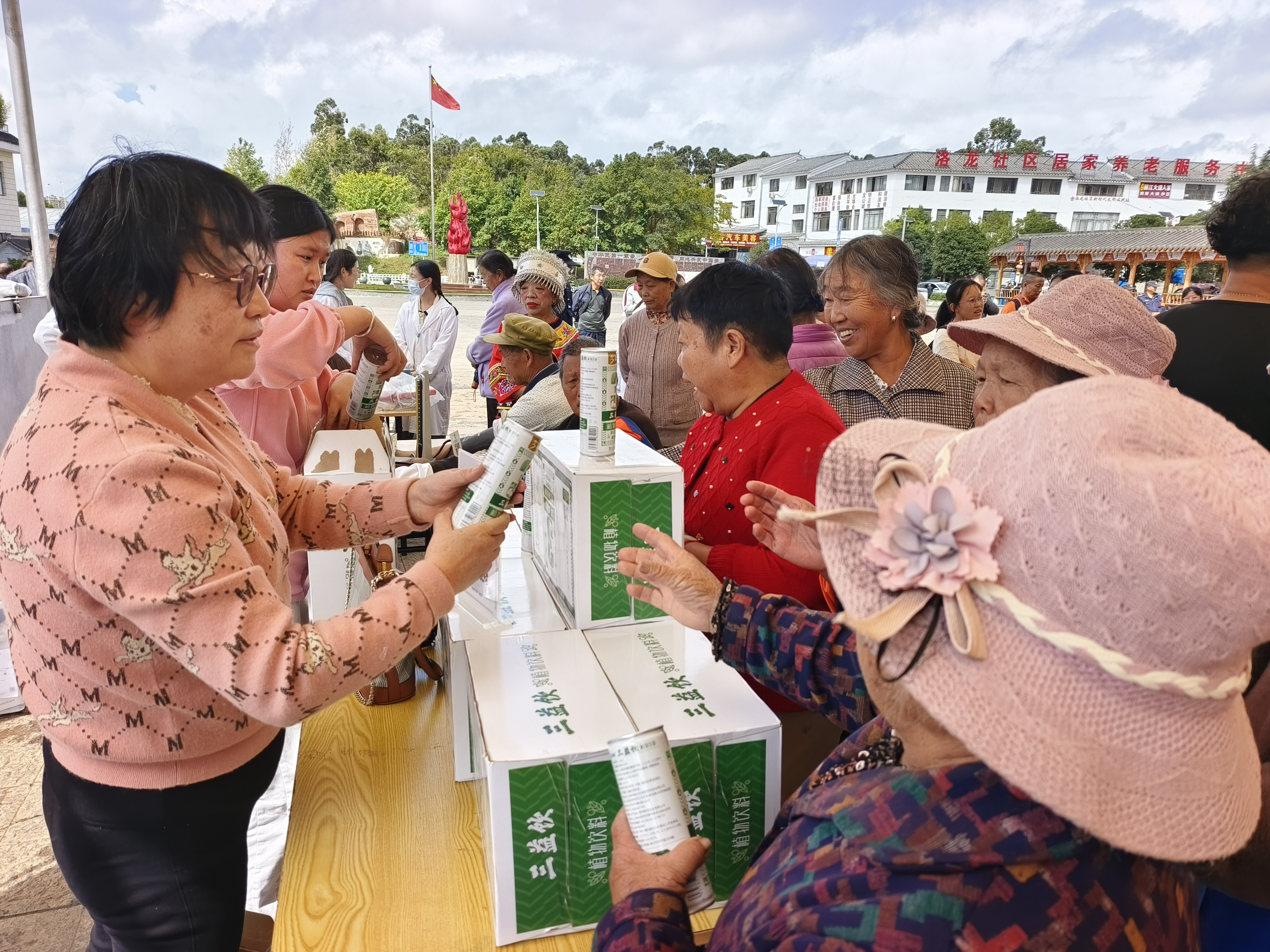 一支服务队由生物医学工程研究院曾跃勤副教授带队,免费发放植物饮料三益饮600瓶,给社区老人送健康送温暖。