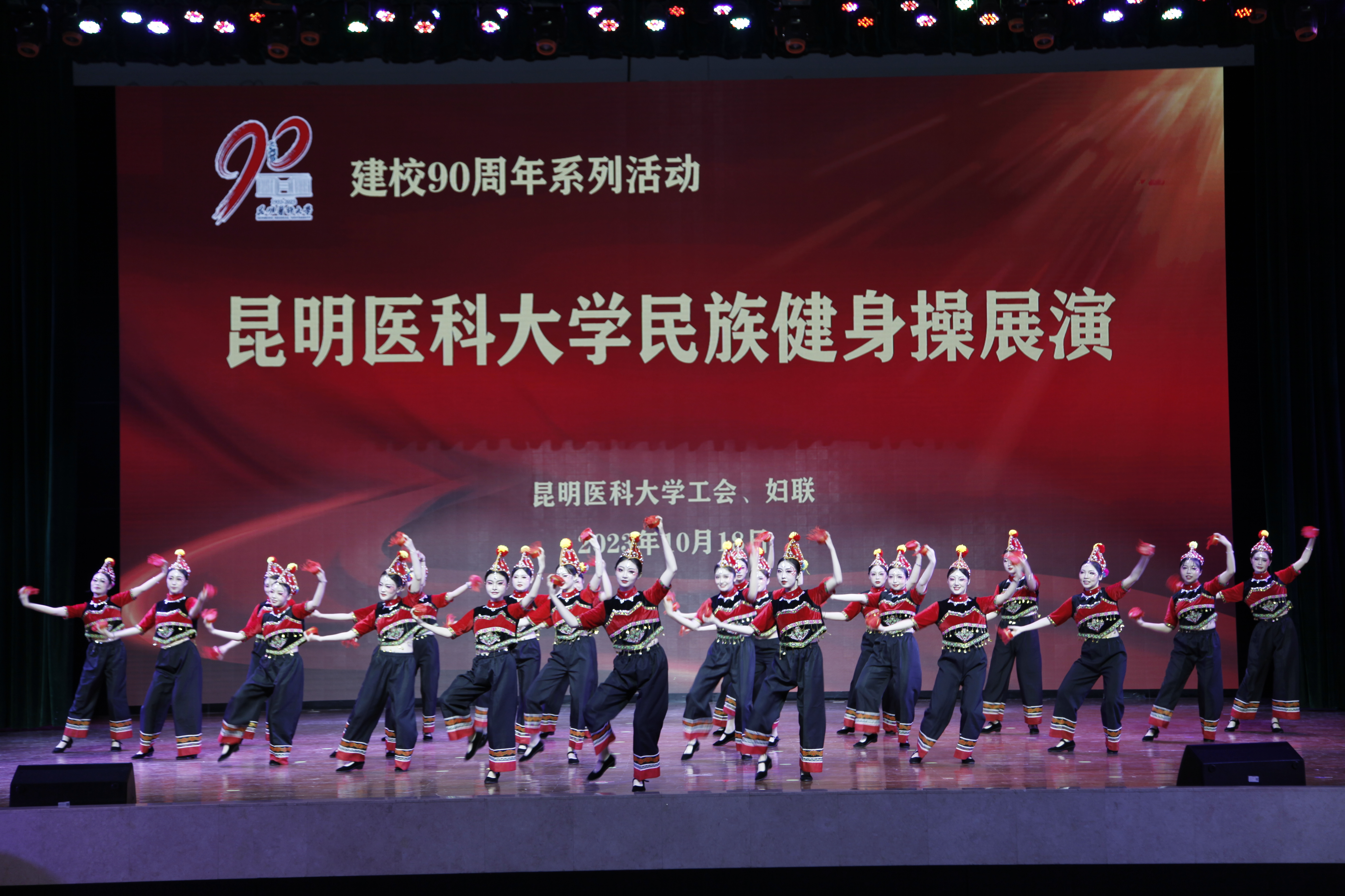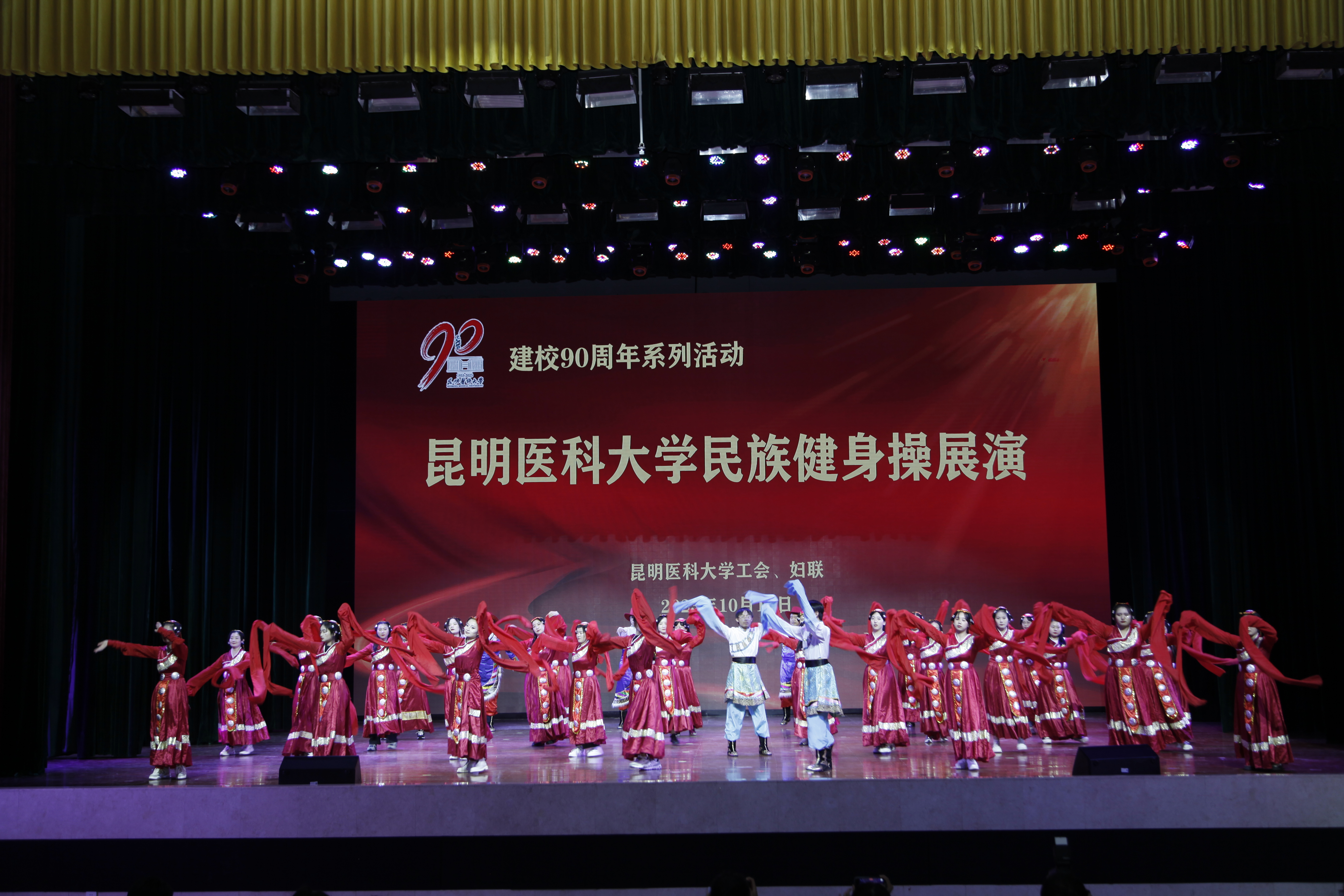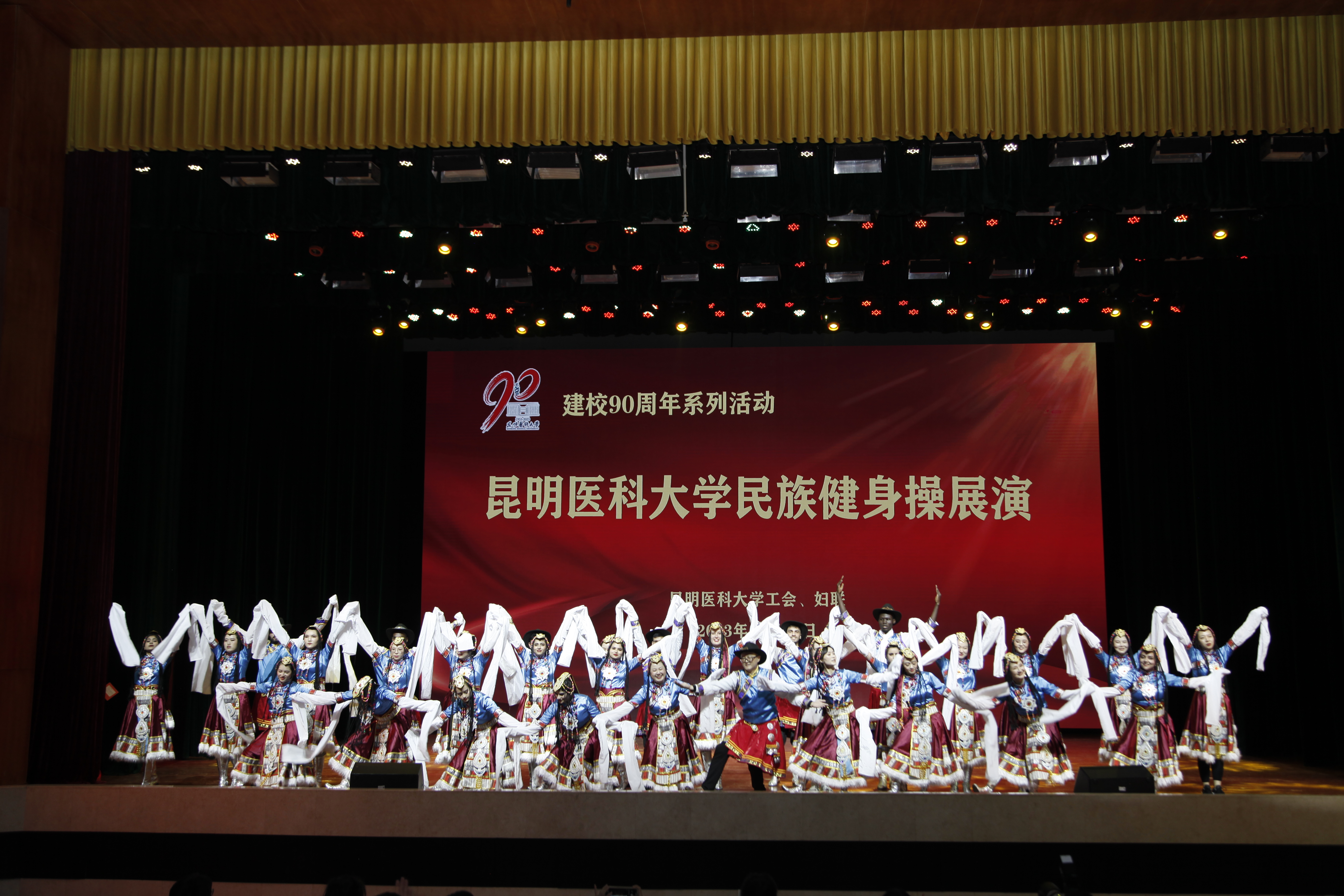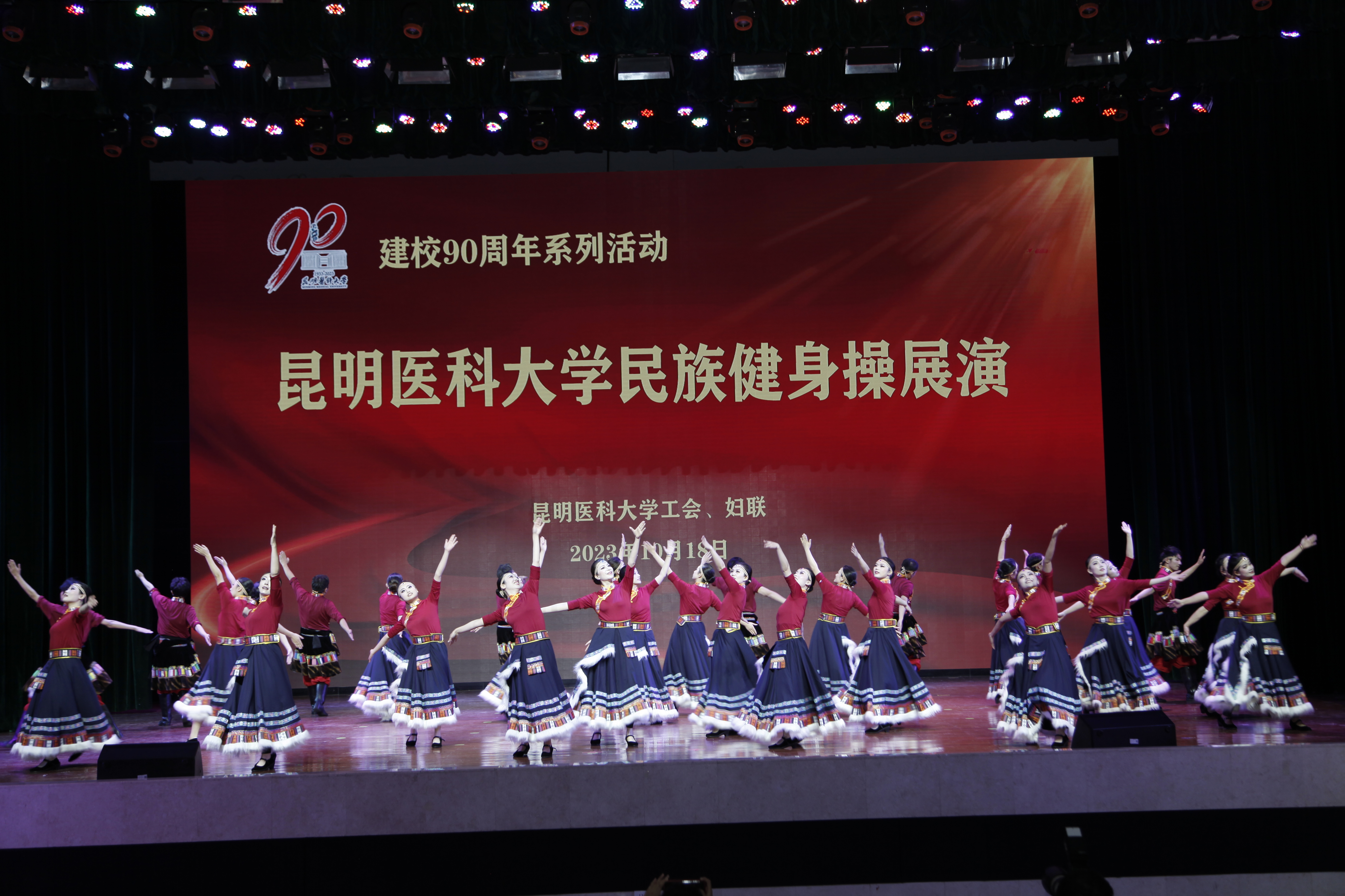 10月18日晚,伟德国际1949官网建校90周年系列活动——民族健身操展演在呈贡校区学生会堂举行。伟德国际1949官网党政领导,相关部门、学院负责人,校工会委员、校妇联执委及师生代表近1200人观看了演出。