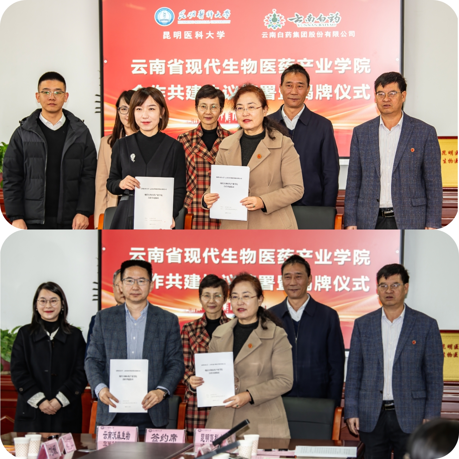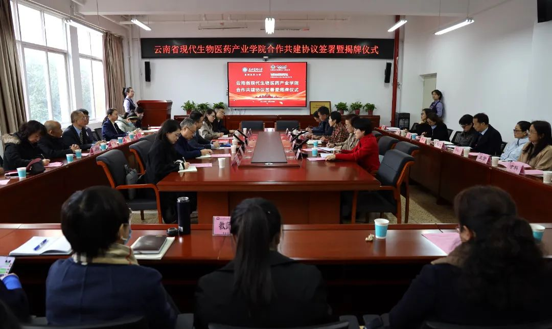 签约仪式后,出席领导在药学楼为云南省现代生物医药产业学院揭牌并与参与代表合影留念。