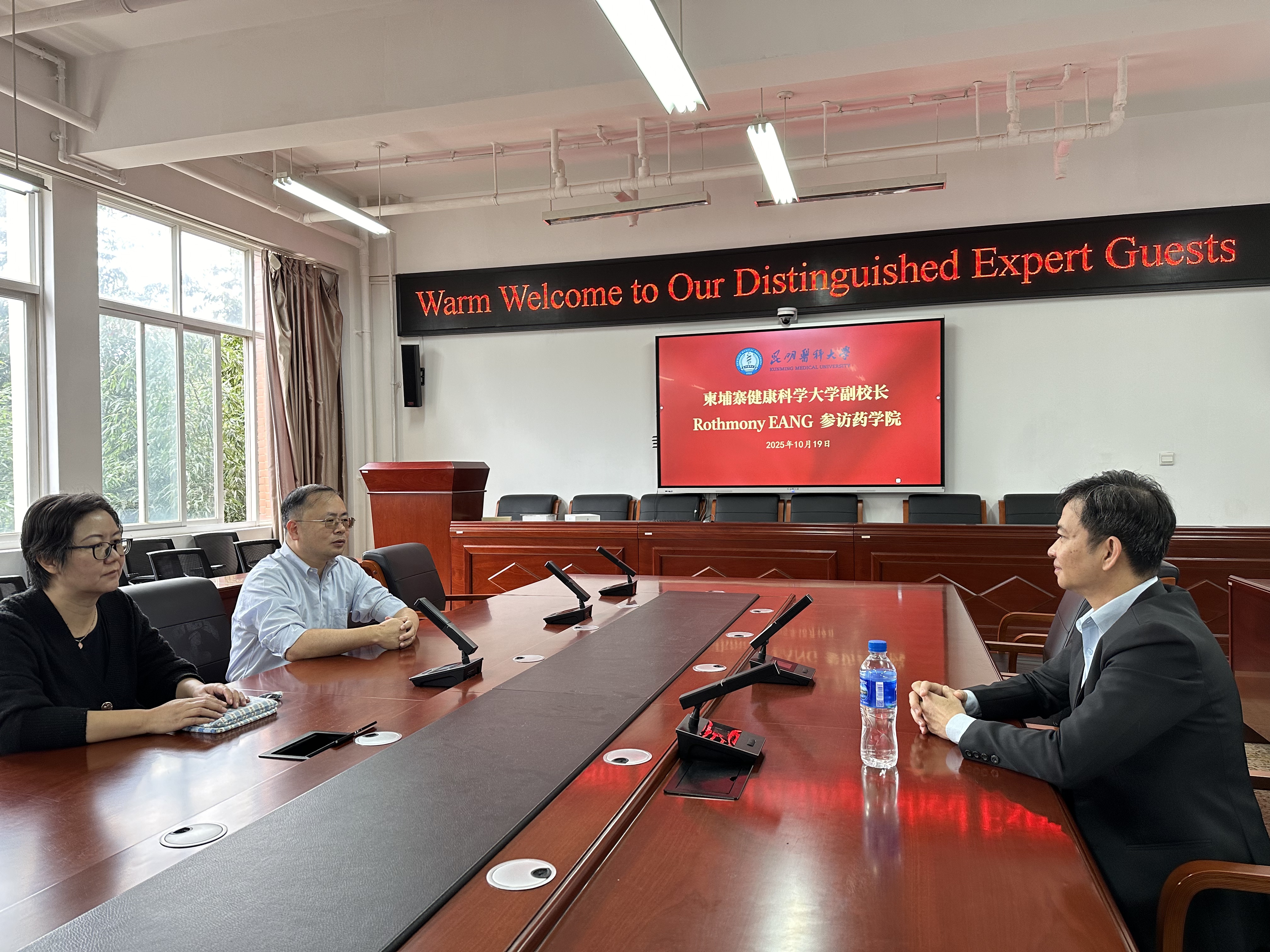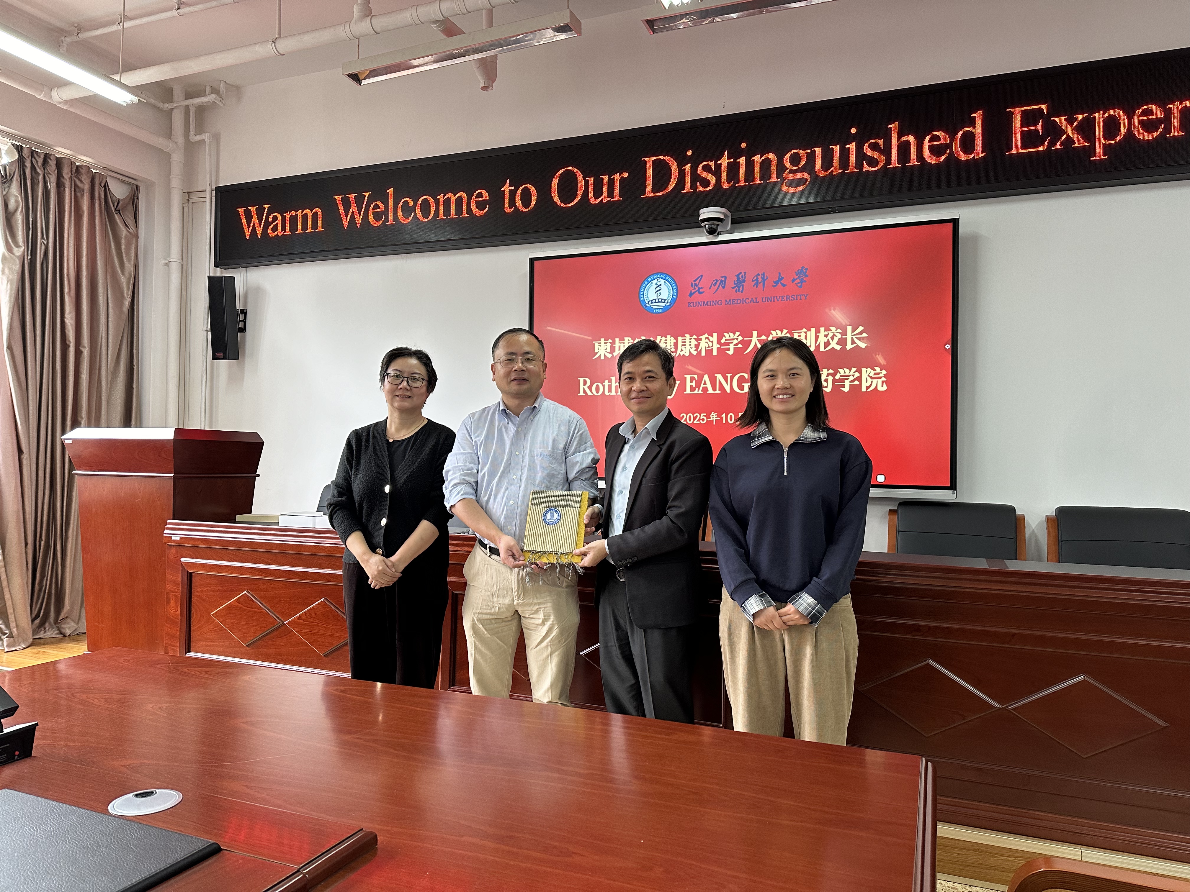 2025年10月19日,柬埔寨健康科学大学副校长Rothmony EANG教授访问伟德国际1949官网药学院(云南省现代生物医药产业学院)。药学院副院长(主持工作)兼云南省天然药物药理重点实验室主任郎靖瑜教授、云南省天然药物药理重点实验室办公室主任周轶平教授、外事秘书田晓雪博士进行了接待。