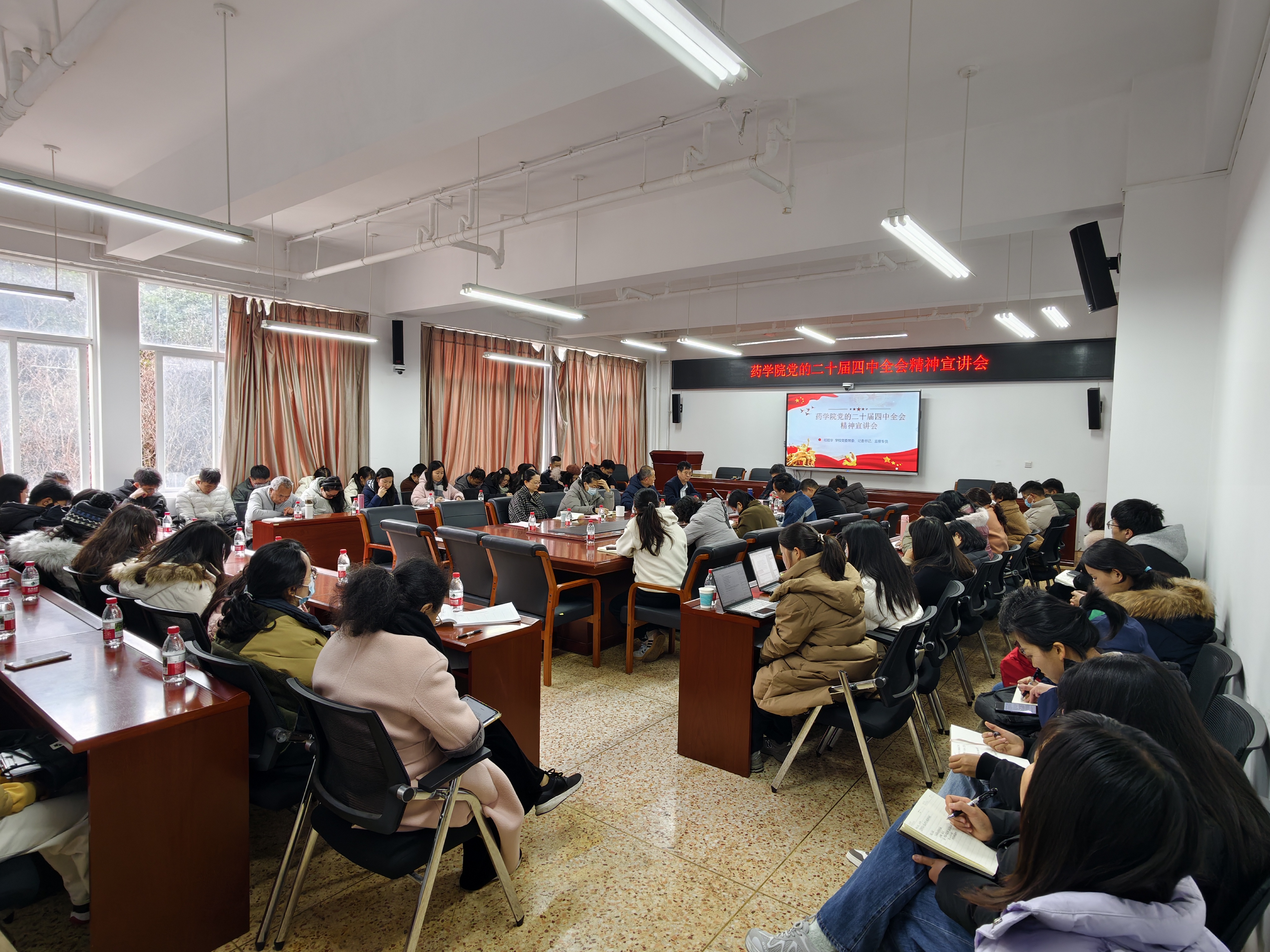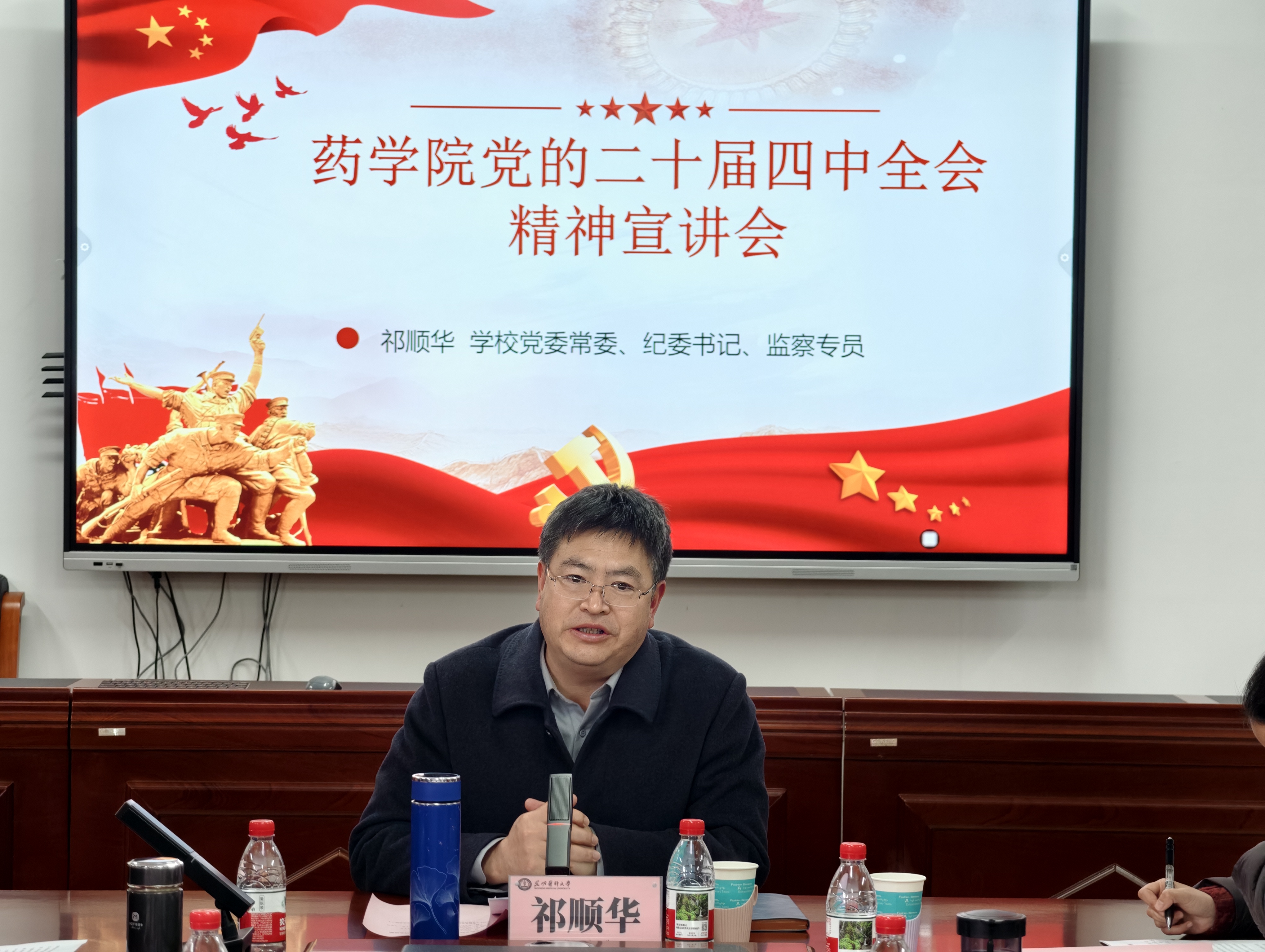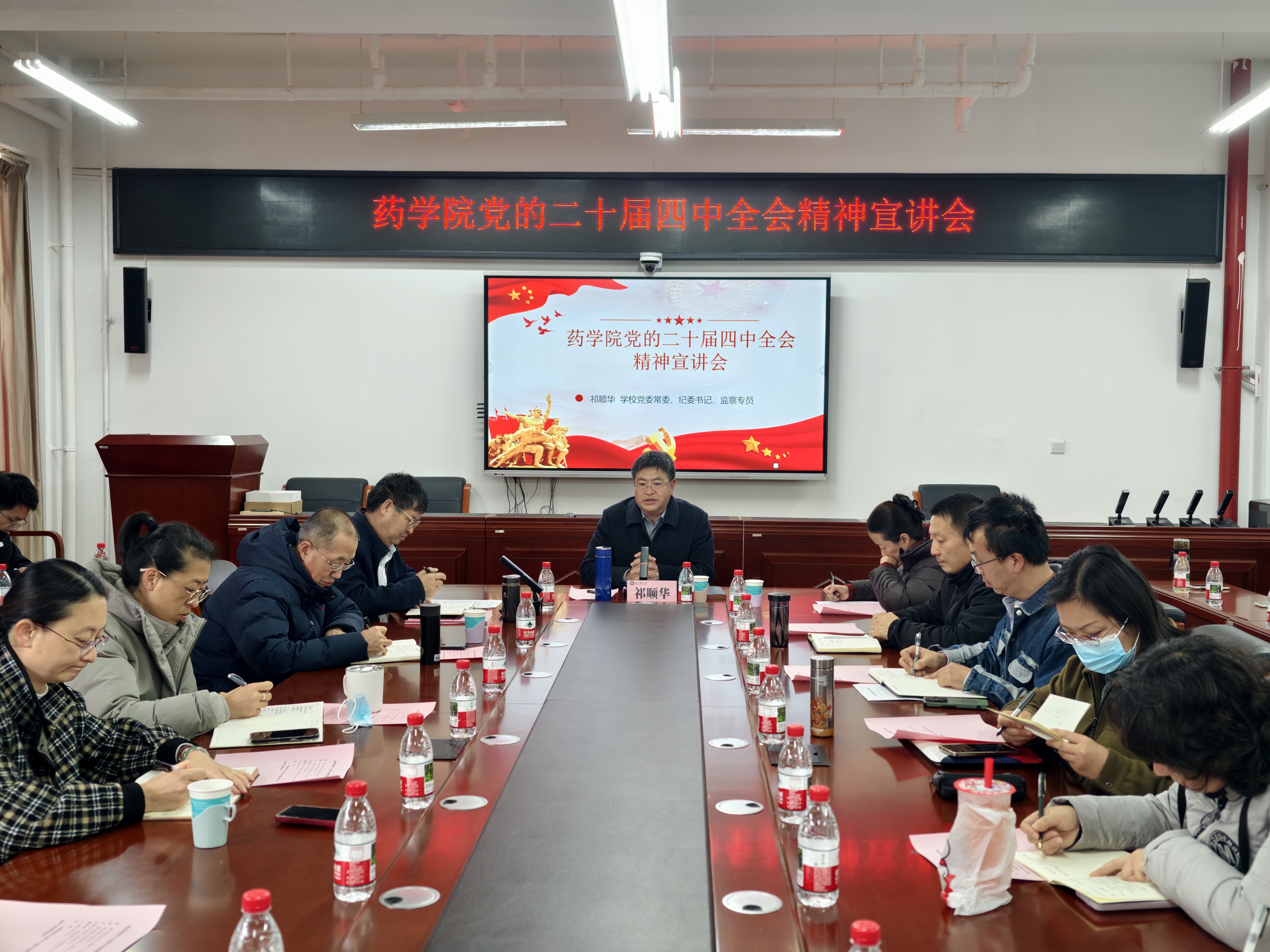2025年12月25日,学校党委常委、纪委书记、监察专员祁顺华到药学院开展党的二十届四中全会精神宣讲。学院党政领导、各部门负责人、支部委员、教师和学生代表参会。会议由学院党委书记张有福主持。