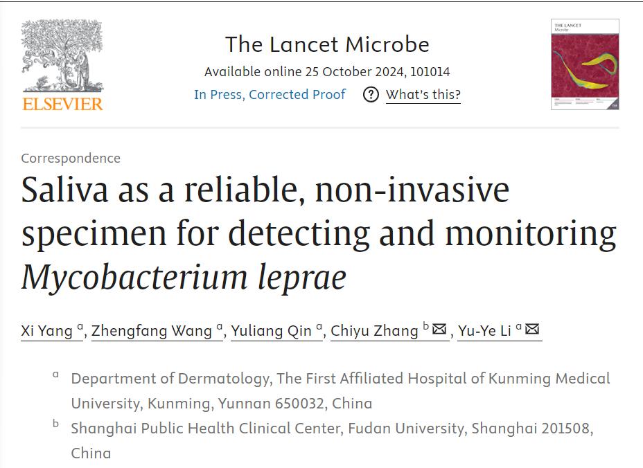 近日,伟德国际1949官网第一附属医院李玉叶教授团队联合上海市公共卫生临床中心张弛宇研究员团队,以伟德国际1949官网为第一单位在国际顶级期刊《The Lancet Microbe》(IF=20.9)上发表了题为“Saliva as a reliable, non-invasive specimen for detecting and monitoring Mycobacterium leprae”的论文。李玉叶教授和张驰宇研究员为通讯作者,李玉叶教授团队的博士研究生杨溪为第一作者。该成果标志着学校以一流学科团队建设为抓手推动高质量发展取得新成效。