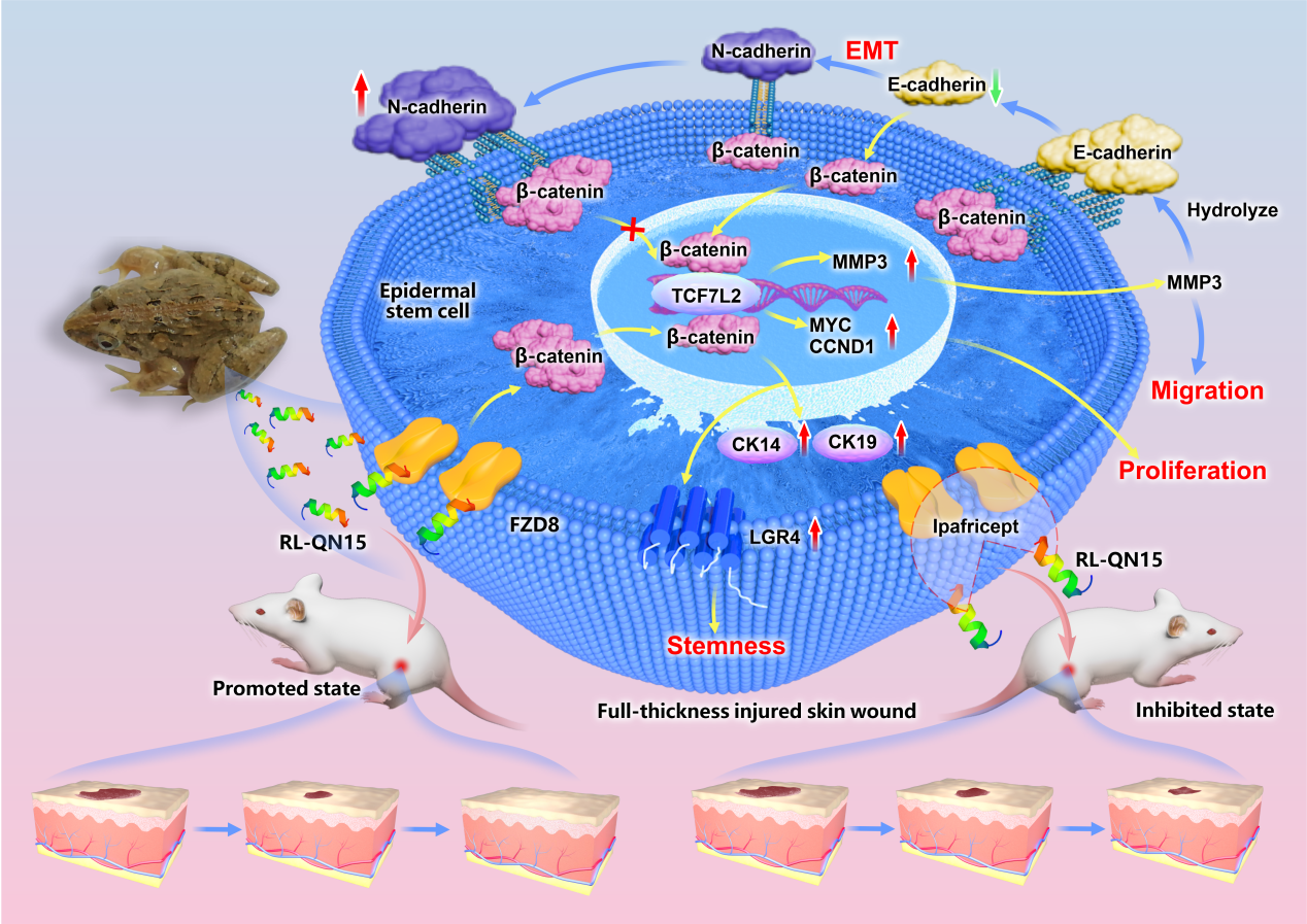 项目组通过该研究发现,活性肽RL-QN15能结合表皮干细胞膜受体FZD8,进而激活Wnt/β-catenin信号通路,调控表皮干细胞功能:促进细胞增殖、迁移、上皮向间充质转化并维持其干性,从而加速皮肤创面修复再生。该研究不仅首次系统阐释了两栖动物活性肽通过调控表皮干细胞促进皮肤再生的机制,更利用活性肽RL-QN15作为“分子探针”,揭示了FZD8在皮肤创面再生修复中的关键治疗靶点的价值,为深入理解皮肤创伤再生机制提供了崭新视角,并为开发基于FZD8靶点的新型促皮肤创面愈合治疗策略奠定了理论基础。