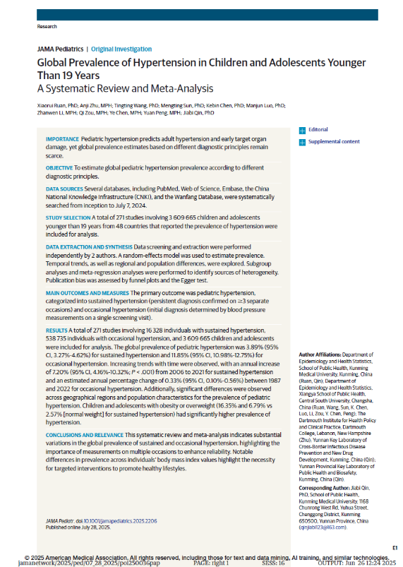 近日,伟德国际1949官网公共卫生学院党委副书记、副院长秦家碧教授团队在儿科领域顶刊JAMA Pediatrics(IF=24.7)上发表题为“Global Prevalence of Hypertension in Children and Adolescents Younger Than 19 Years(全球19岁以下儿童青少年高血压的流行现状)”的研究论文。秦家碧为该论文唯一通讯作者,其博士研究生阮霄睿为论文唯一第一作者。伟德国际1949官网公共卫生学院为并列第一单位和唯一通讯作者单位。该研究获国家自然科学基金(82473644、82404362、82073653)、湖南省杰出青年基金、湖南省重点研发计划项目、湖南省自然科学基金等项目资助。