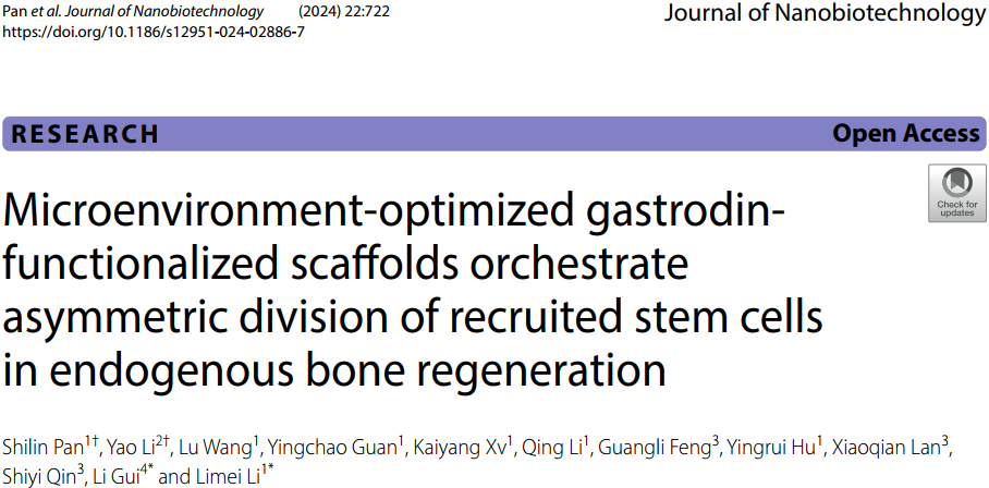 近日,伟德国际1949官网康复学院暨云南省干细胞和再生医学重点实验室李丽梅副教授团队,以伟德国际1949官网为第一单位在Journal of Nanobiotechnology(一区Top,IF=10.6)期刊上发表了题为“Microenvironment-optimized gastrodin-functionalized scaffolds orchestrate asymmetric division of recruited stem cells in endogenous bone regeneration”的科研论文。李丽梅和云南省第三人民医院内分泌科教授桂莉为论文通讯作者,伟德国际1949官网康复学院暨云南省干细胞和再生医学重点实验室博士研究生潘世林、云南省第一人民医院口腔医学中心主任医师李瑶为论文第一作者。该研究工作得到了国家自然科学基金项目、云南省科技厅基础研究计划面上项目、云南省科技厅—伟德国际1949官网联合专项的资助。