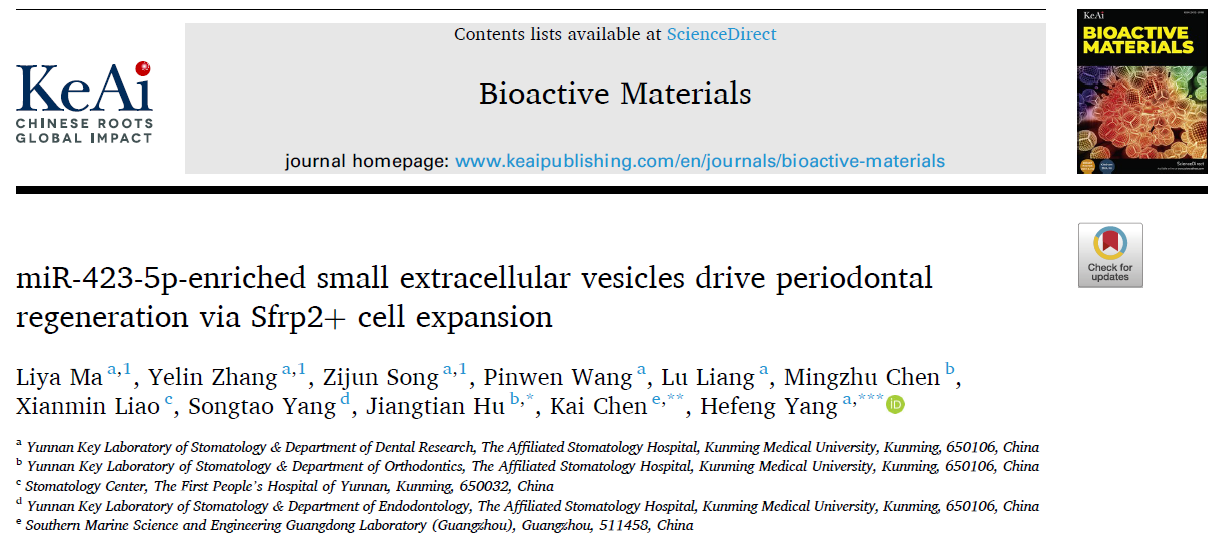 2025年11月,伟德国际1949官网附属口腔医院杨禾丰、胡江天教授团队以伟德国际1949官网为第一/通讯单位在期刊《Bioactive Materials》(中国科学院医学1区Top,IF=20.3)发表题为“miR-423-5p-enriched small extracellular vesicles drive periodontal regeneration via Sfrp2+ cell expansion”的研究论文。杨禾丰和胡江天、广州海洋实验室研究员陈凯为共同通讯作者,伟德国际1949官网附属口腔医院博士研究生马丽娅、硕士研究生张晔琳和博士研究生宋子珺为共同第一作者。该研究工作得到国家自然科学基金、伟德国际1949官网科研平台、伟德国际1949官网一流学科团队和云南省口腔医学重点实验室的支持。