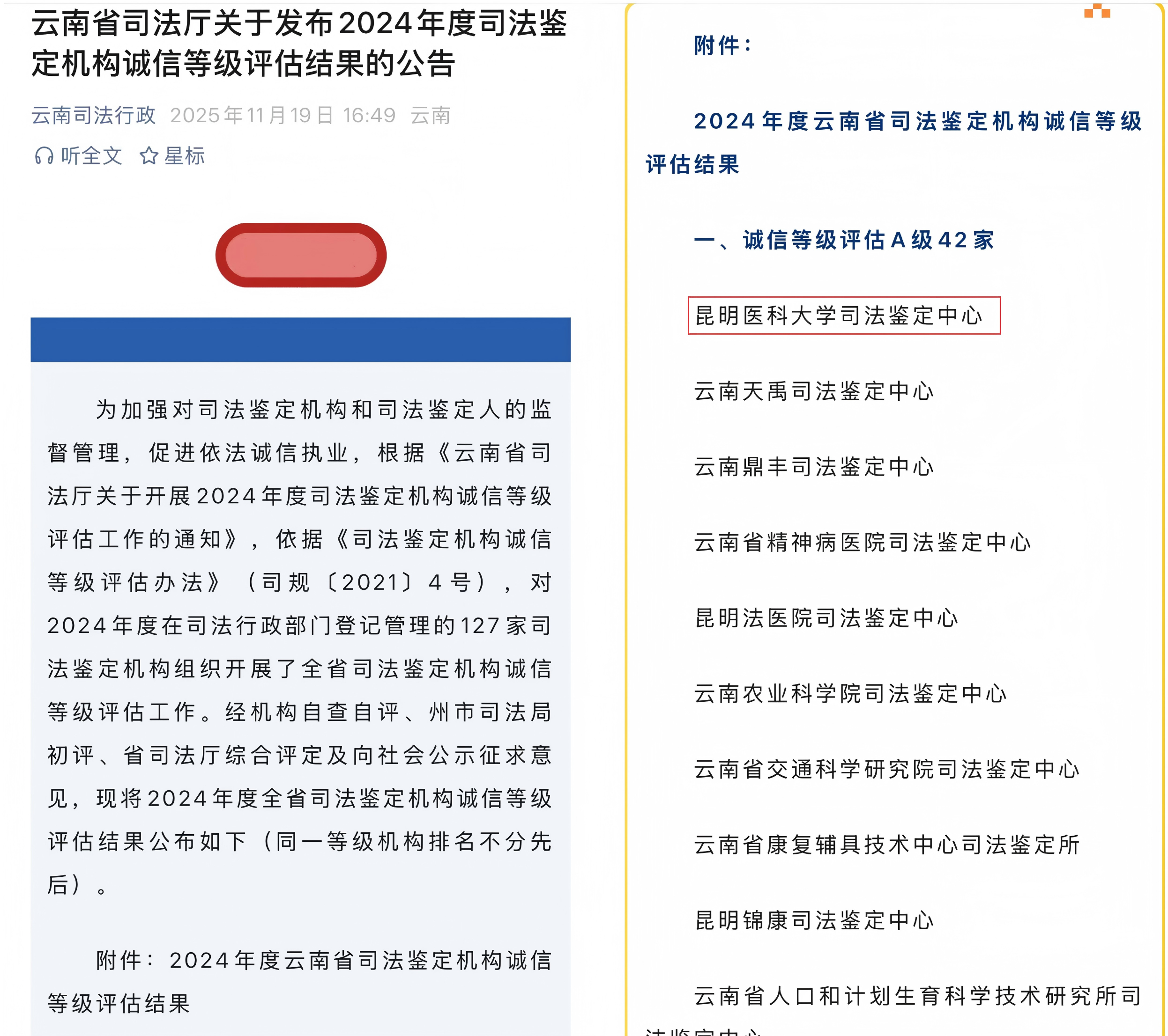 近日,云南省司法厅发布了《关于2024年度司法鉴定机构诚信等级评估结果的公告》,伟德国际1949官网司法鉴定中心获评A级。