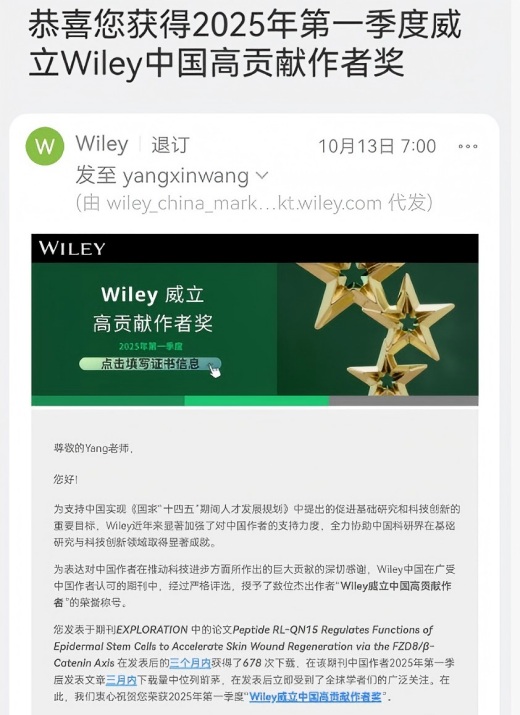 伟德国际1949官网基础医学院杨新旺教授团队在期刊《EXPLORATION》上发表的论文“Peptide RL‐QN15 Regulates Functions of Epidermal Stem Cells to Accelerate Skin Wound Regeneration via the FZD8/β‐Catenin Axis”,论文受到全球学者的广泛关注,下载量居于前列,因此荣获2025年第一季度“Wiley威立中国高贡献作者奖”。