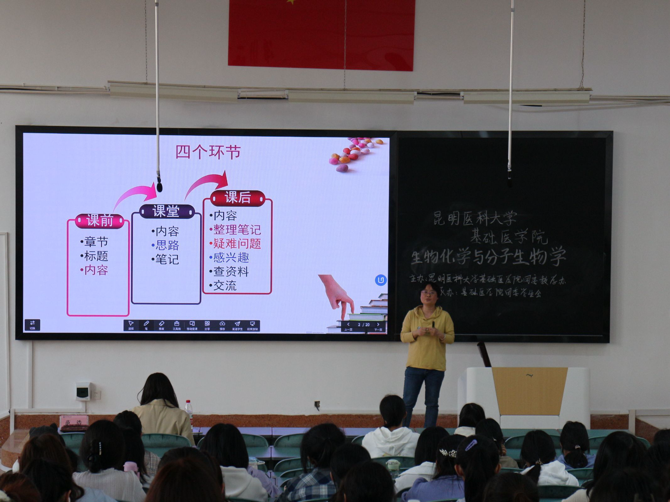 第二个环节中,倪静怡同学给同学们分享了自己生化学习中总结的“干货”。在对生化的理解,生化的重要性,生化的学习方法,以及建议的叙述中,她认为上课跟随老师思路认真听讲,课后整理笔记、抓住重点针对性记忆以及课前五分钟复习前课知识点尤为重要,最后倪静怡同学告诉大家“好的大学没有围墙”,鼓励同学们找到一套属于自己的学习方法和记忆方法,让学习更加轻松有趣。