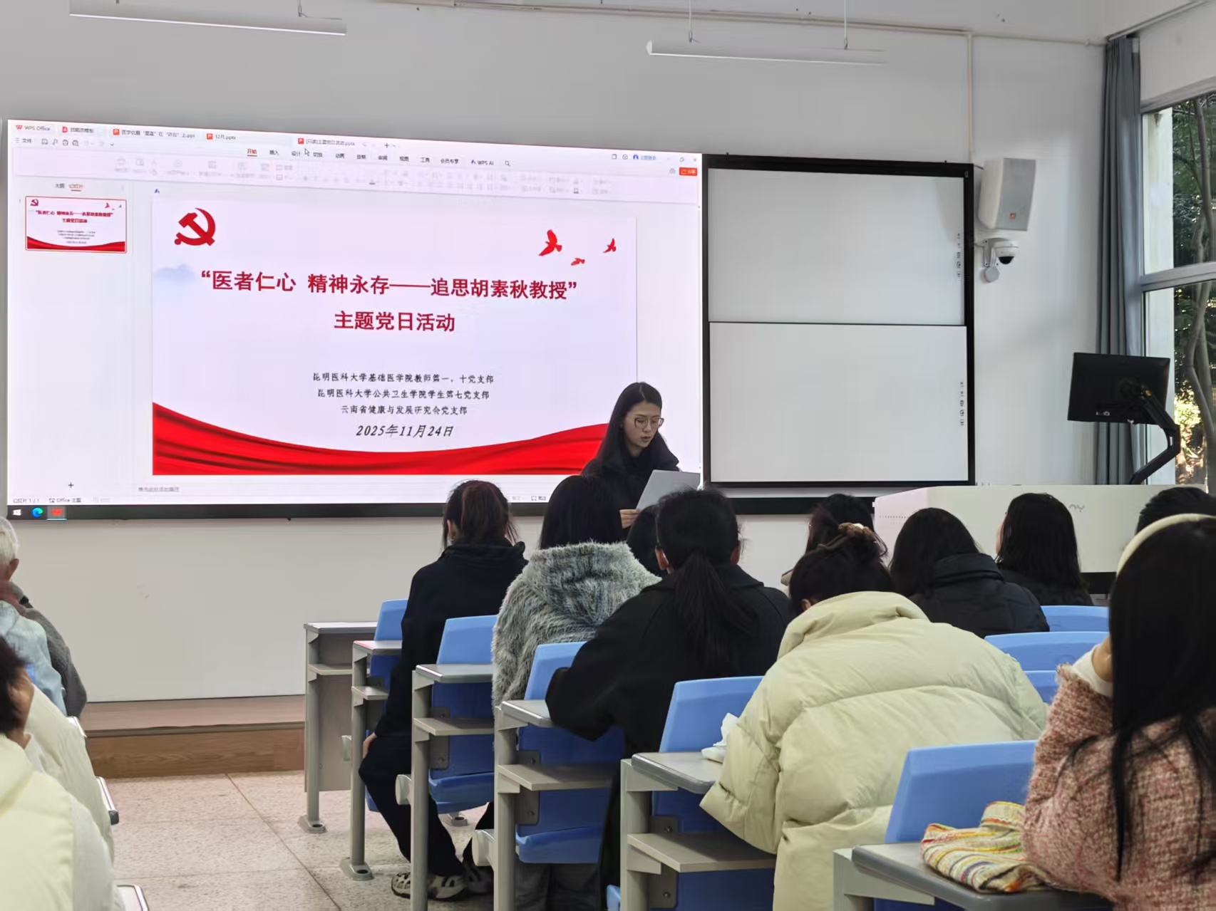 为深入学习弘扬老一辈医学教育家胸怀家国、献身科学的崇高精神,筑牢党员理想信念与职业信仰,2025年12月19日,伟德国际1949官网基础医学院教师第一党支部、教师第十党支部、公共卫生学院学生第七党支部和云南省健康与发展研究会党支部共同组织开展“医者仁心·精神永存”主题党日活动。活动以深切缅怀胡素秋、李秉权教授的感人事迹为主线,通过沉浸式、体验式的教育形式,引导广大党员在医学人文精神的洗礼中强化党性修养、牢记育人使命。