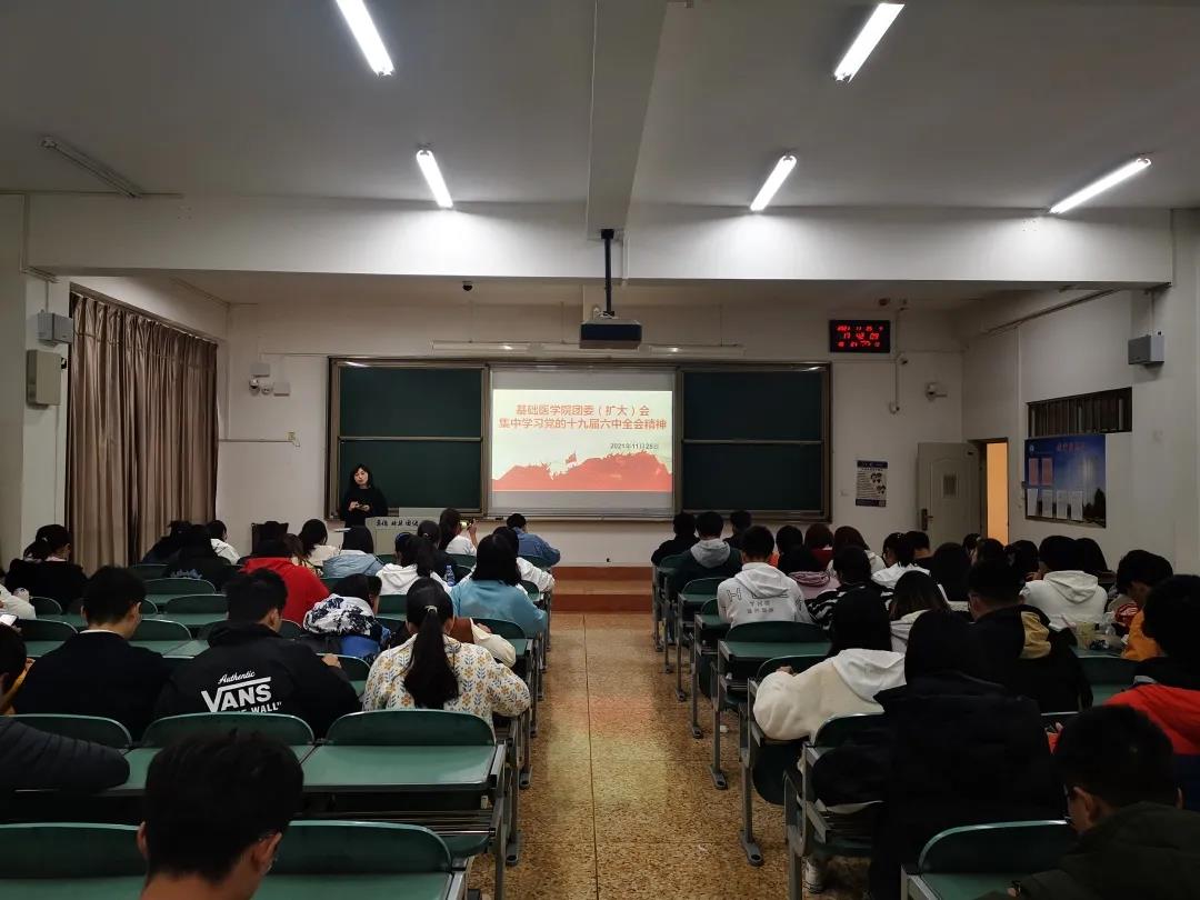 2021年11月25日下午17:40,基础医学院团委(扩大)会传达学习党的十九届六中全会精神,对党的十九届六中全会基本情况、主要精神和重大意义进行认真学习领会。会议在西苑教学楼3103召开,由基础医学院团委书记何浏老师进行领学。