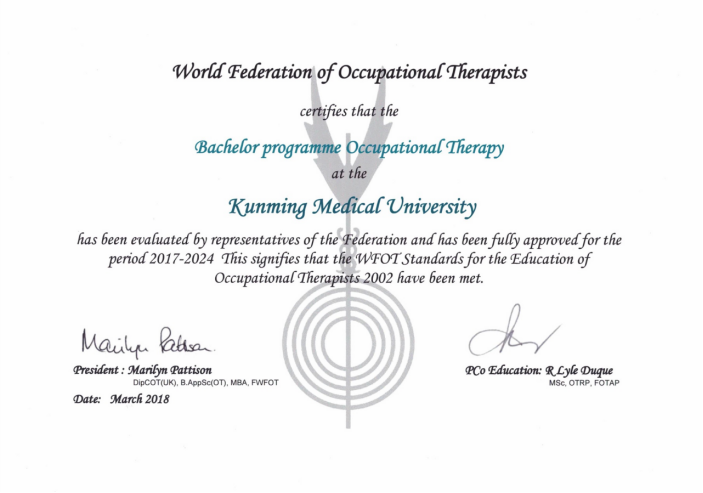 伟德国际1949官网作业治疗专业于2010年首次通过世界作业治疗联盟(World Confederation of Occupational Therapists, WFOT) 本科教育标准的认证。此次所获七年期完全认证,意味着我校的作业治疗课程更进一步获得了国际社会的完全认可,对提升学校、学院、专业的国际影响力,促进了学校与国际上开办本专业的相关院校的交流与合作,对推进一流专业建设将产生深远的影响。
