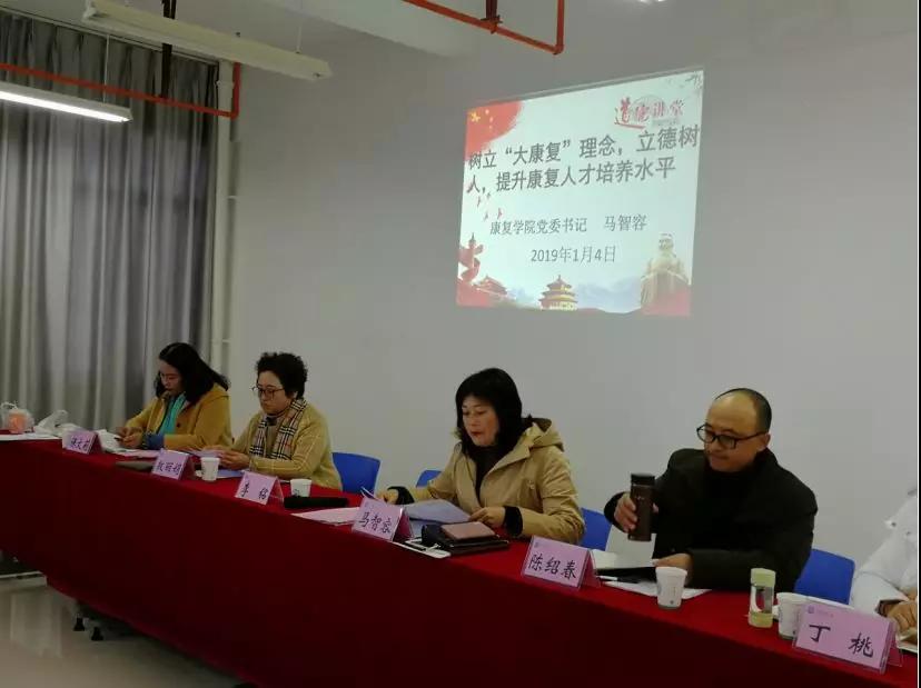 康复学院党委书记马智容作了“进一步树立‘大康复’理念,立德树人,提升康复人才培养水平”的讲话,简要回顾2018年康复学院教师队伍建设工作的开展情况,对存在问题进行客观评价,并对加强康复教师队伍建设提出希望。