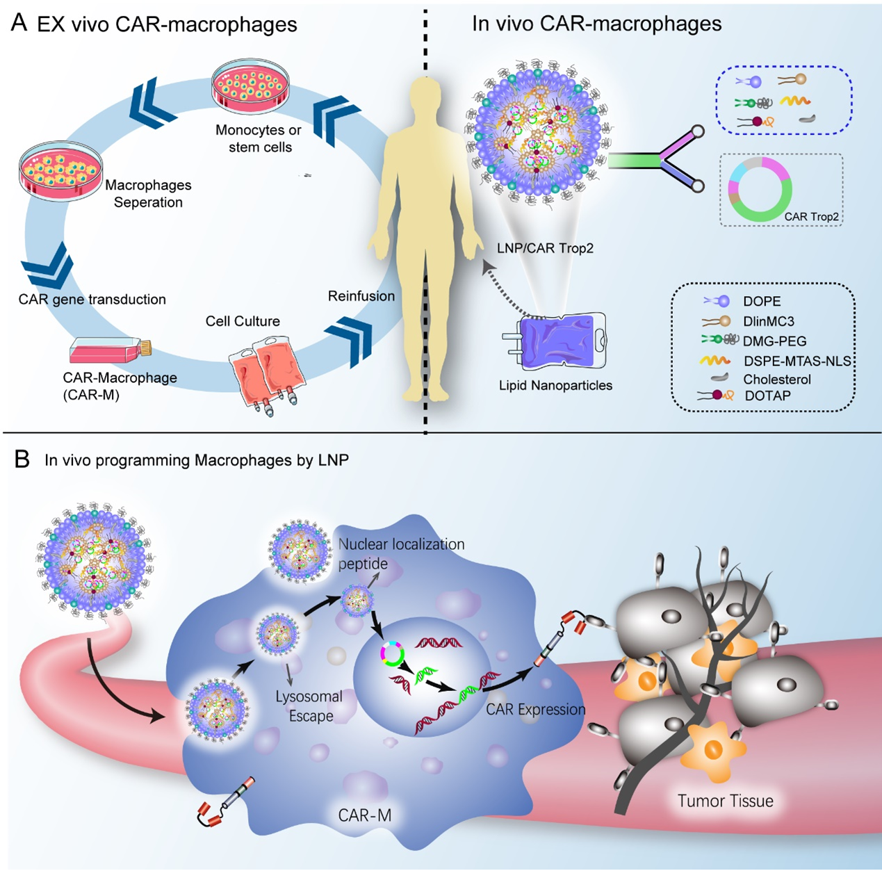 嵌合抗原受体(CAR)技术彻底改变了血液系统恶性肿瘤的临床治疗,取得了显著的成果。值得注意的是,嵌合抗原受体T细胞 (CAR-T) 在治疗急性淋巴细胞白血病(ALL)和B细胞淋巴瘤方面表现出非凡的疗效,导致市场上有9种CAR-T产品上市。CAR-T疗法的成功激发了对其他免疫细胞(如CAR-NK自然杀伤细胞和CAR-M巨噬细胞)的进一步研究。2020年,HER2靶向CAR-M疗法(CT-0508)成为首个完成FDA批准的I期试验的CAR-M产品,证明了其良好的抗肿瘤效果和生物安全性。然而,由于涉及复杂的离体制造程序,其临床实施面临挑战。基于纳米药物递送系统在体内很容易被巨噬细胞吸收,我们在这里提出了一种在体生成 CAR-M的方法来治疗乳腺癌等实体瘤。