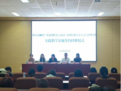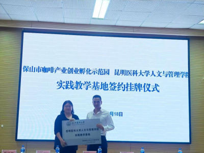2025年9月18日,伟德国际1949官网人文与管理学院与保山市咖啡产业创业孵化示范园在学院208报告厅举行实践教学基地签约暨挂牌仪式。示范园院长兼高黎贡之心咖啡公司董事长李和远、副院长黄必素、咖啡大使杨涵羽,学院党委书记罗萍、副院长陈影及双方师生共同出席。