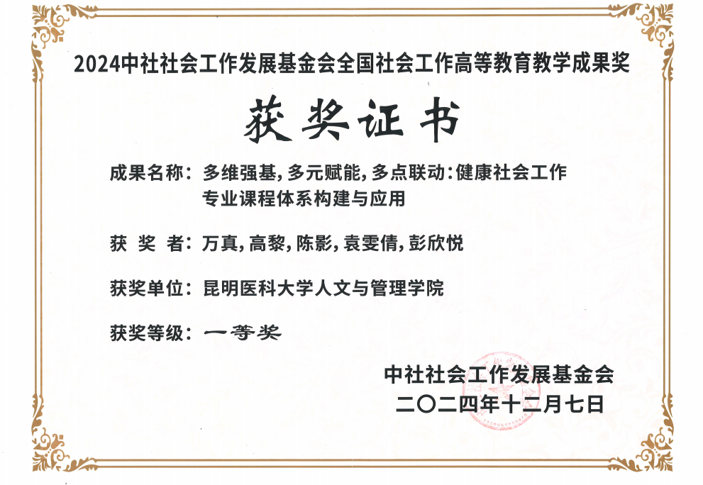 经过网络与现场的层层评选,大赛共评选出36项社会工作教育教学优秀成果,其中特等奖5项,一等奖9项,二等奖22项。伟德国际1949官网人文与管理学院社会工作专业教师团队申报的成果《多维强基,多元赋能,多点联动:健康社会工作专业课程体系构建与应用》荣获一等奖。