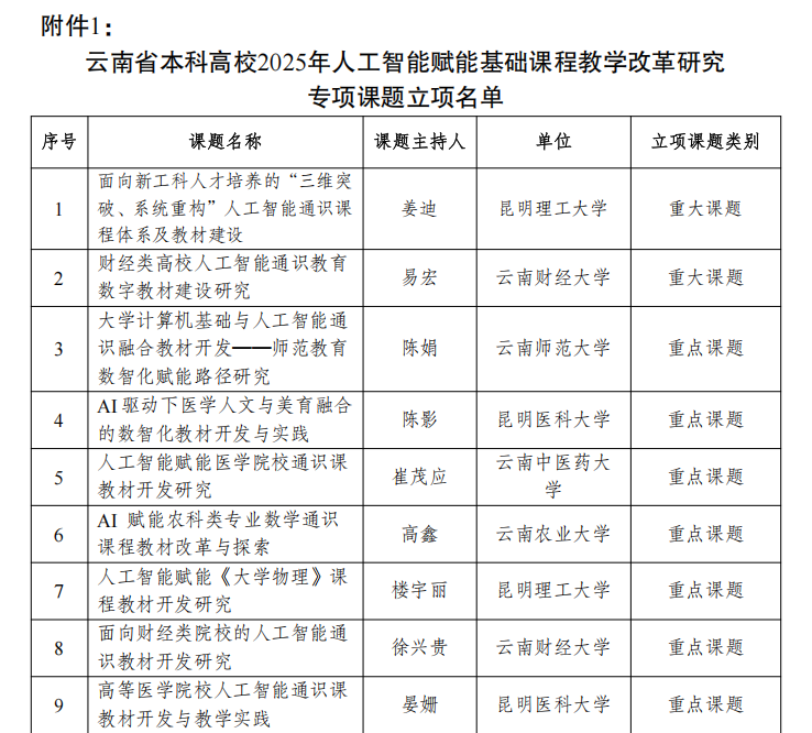 近日,云南省本科高校课程建设专家指导委员会(以下简称“课指委”)公布2025年人工智能赋能基础课程教学改革研究专项课题立项名单,学校人文与管理学院教师陈影申报的《AI驱动下医学人文与美育融合的数智化教材开发与实践》获重点课题立项资助。