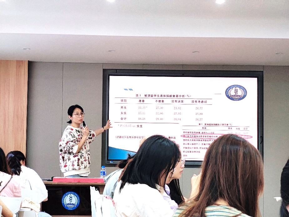 首先,高丽萍老师从“医生行医的目的是什么”“医生最大的敌人是什么”“医生最重要的本领是什么”三个问题出发,引起同学们思考,然后围绕“生前预嘱”“遗体捐赠”“安乐死”三份协议阐述了医学中的情、理、法。“生前预嘱”是情,大部分人都能接受情,“遗体捐赠”是理,大家明理但可以不接受,“安乐死”是法,是我们在医疗实践中的难题。