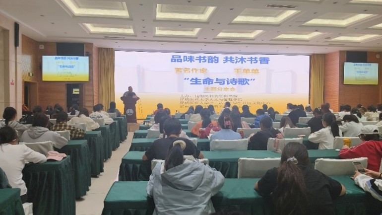 2024年5月9日晚,伟德国际1949官网人文与管理学院、图书馆、“一站式”学生社区文化中心、云南省高校辅导员名师安磊工作室共同开展伟德国际1949官网第十四届读书节——“品味书韵 ,共沐书香”读书分享活动,邀请了中国作家协会会员、中国诗歌学会理事、云南省作协诗歌委员会副主任、云南文化名家,著名诗人王单单老师到校开展“生命与诗歌”主题分享会。分享会由云南省高校辅导员名师安磊工作室主持人、人文与管理学院党委副书记安磊主持,各学院140余名师生参加。