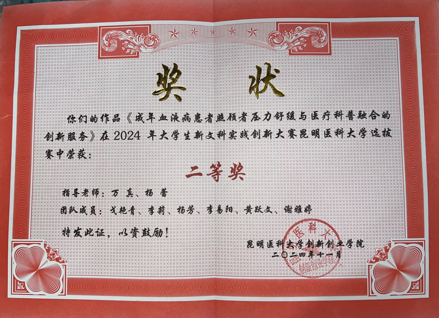 为进一步深化创新创业教育改革,拓展实践育人的空间和阵地,推动新文科建设走深走实,全面提升学生的创新思维和实践能力,伟德国际1949官网2024 年大学生新文科实践创新大赛在校举行。我院社会工作专业的戈艳青、李莉、杨芳、黄跃文,以及基础医学院临床医学专业的李易阳、谢雅婷六名同学组成的血液科医文融合实践服务队,在社工系万真老师和云加益社会工作服务中心杨蕾老师的精心指导下,带来了项目《成年血液病患者照顾者压力舒缓与医疗科普融合的创新服务》。该项目凭借其独到的视角、深入的研究和创新的实践方法,在网评中荣获二等奖,成功晋级校赛。在11月27日的现场答辩环节,该团队以更加成熟和自信的姿态亮相,他们的表现赢得了评委们的高度评价,最终以第二名的优异成绩闯入全国总决赛,并获得国家级优秀奖.