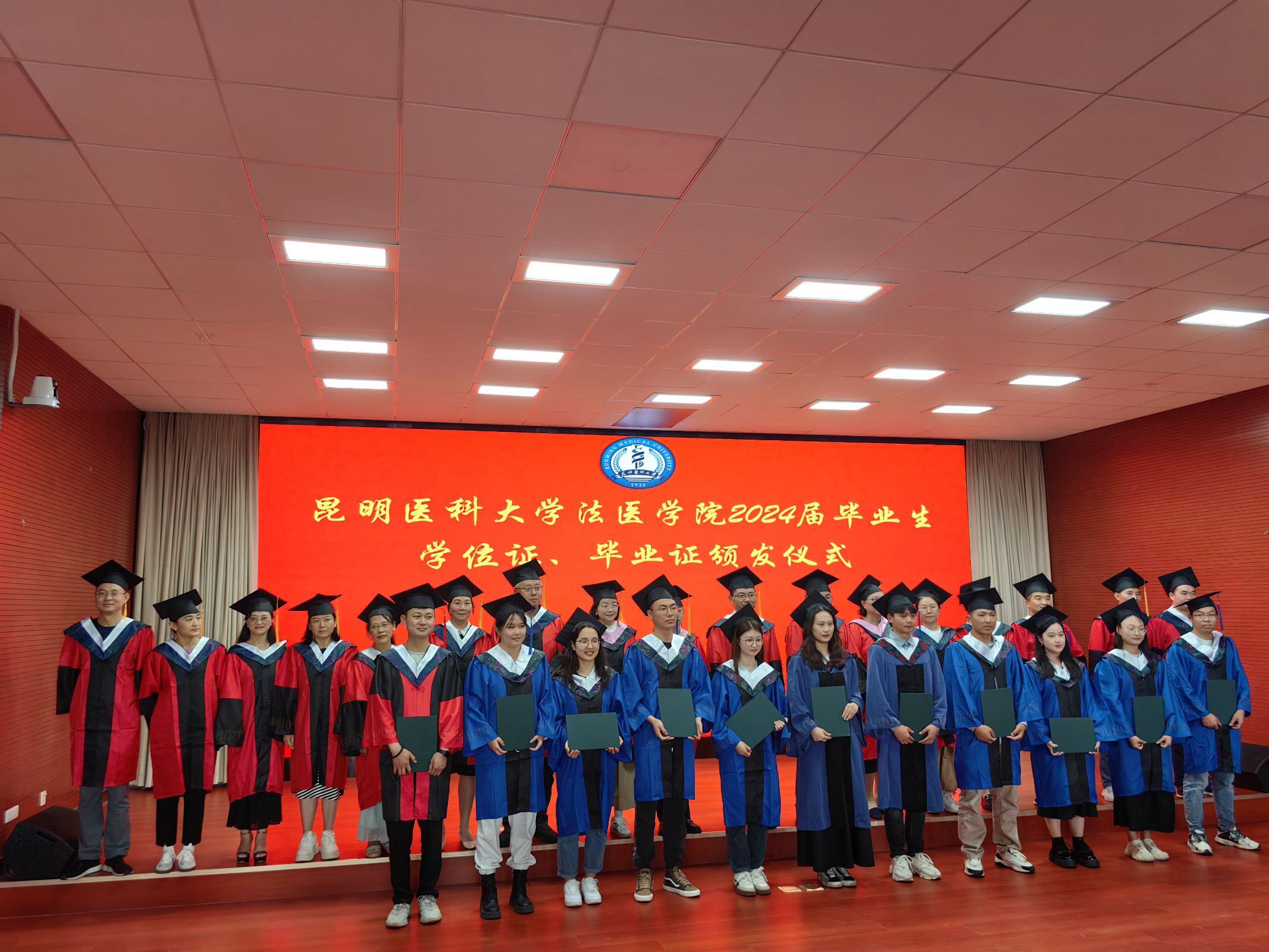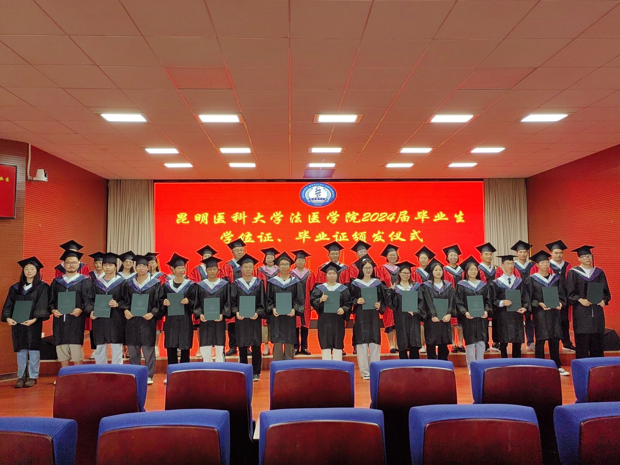 2024年6月26日下午法医学院全体党政领导、教职工以及2024届毕业生齐聚一堂,在法医学院模拟法庭隆重举行了毕业典礼,部分学生家长代表亦应邀出席。典礼由法医学院党委唐敏书记主持。典礼上,本科毕业生代表、硕士毕业生代表、在校学生代表、教师代表依次发言,法医学院院长洪仕君教授致辞。全体硕士、博士生导师共同为获得博士、硕士、学士学位的152名毕业生颁发了学位证书。此外,学院对本科升研学生进行表彰。