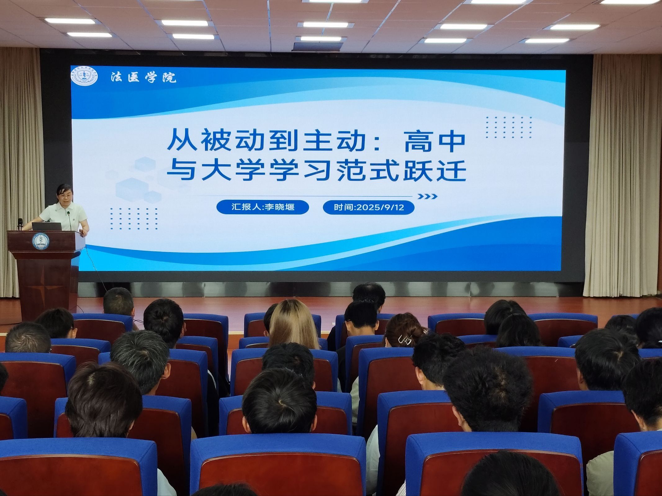2025年9月12日,法医学院在模拟法庭举行2025级新生见面会暨“开学第一课”。学院党政领导、各办公室负责人、系主任,以及新生辅导员、班主任和新生依次见面,并为全体2025级新生授予院徽。