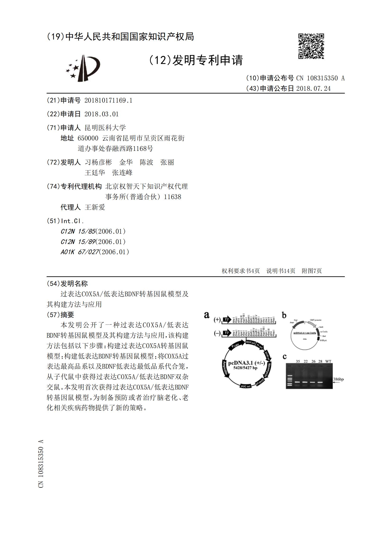 过表达COX5A低表达BDNF转基因鼠模型及其构建方法与应用