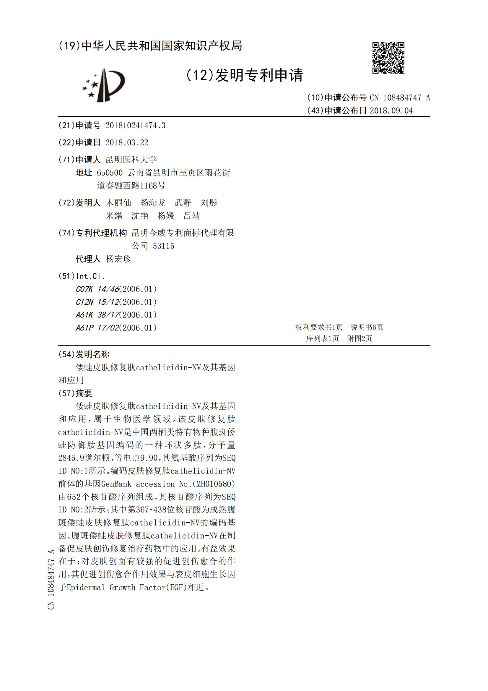 倭蛙皮肤修复肽cathelicidin-NV及其基因和应用