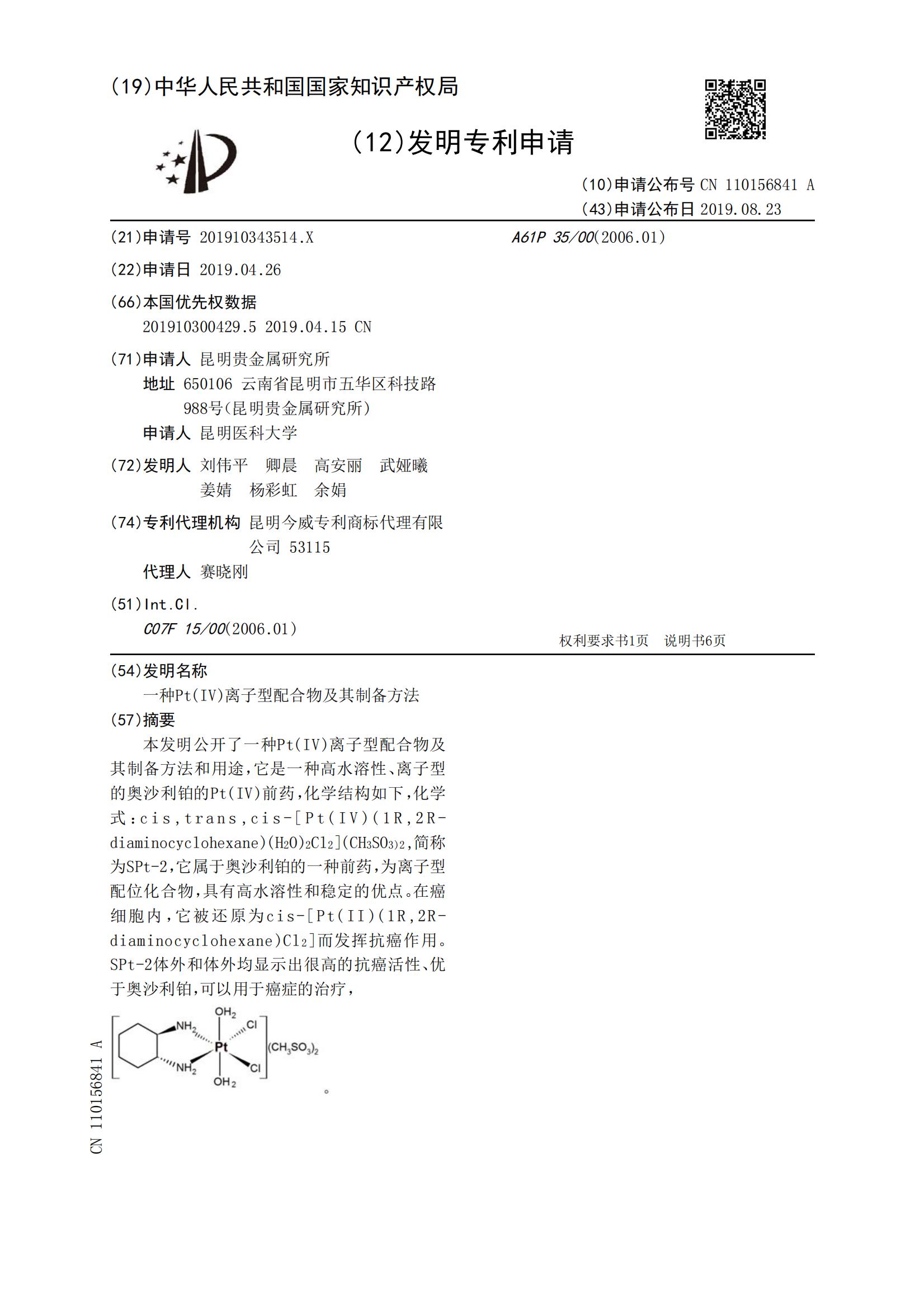 一种Pt(IV)离子型配合物及其制备方法