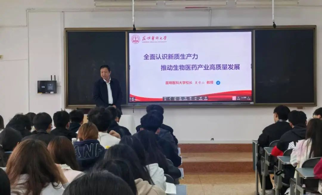课堂上,夏雪山从历史发展的逻辑、全球视野的维度系统分析了新质生产力提出的时代背景,基于国家战略和现实需要阐述了新质生产力的丰富内涵,围绕国内外经济发展形势探讨了发展新质生产力的原因,结合新兴产业和未来产业发展全面分析和展望了如何发展新质生产力。在讲授发展新质生产力对高等教育提出的新要求问题上,他强调必须坚持教育奠基、创新驱动、人才引领系统推进,为新质生产力发展提供坚实的高等教育基础,构建新型产学研用一体化平台,塑造发展的新动能新优势,有效实现高质量发展。