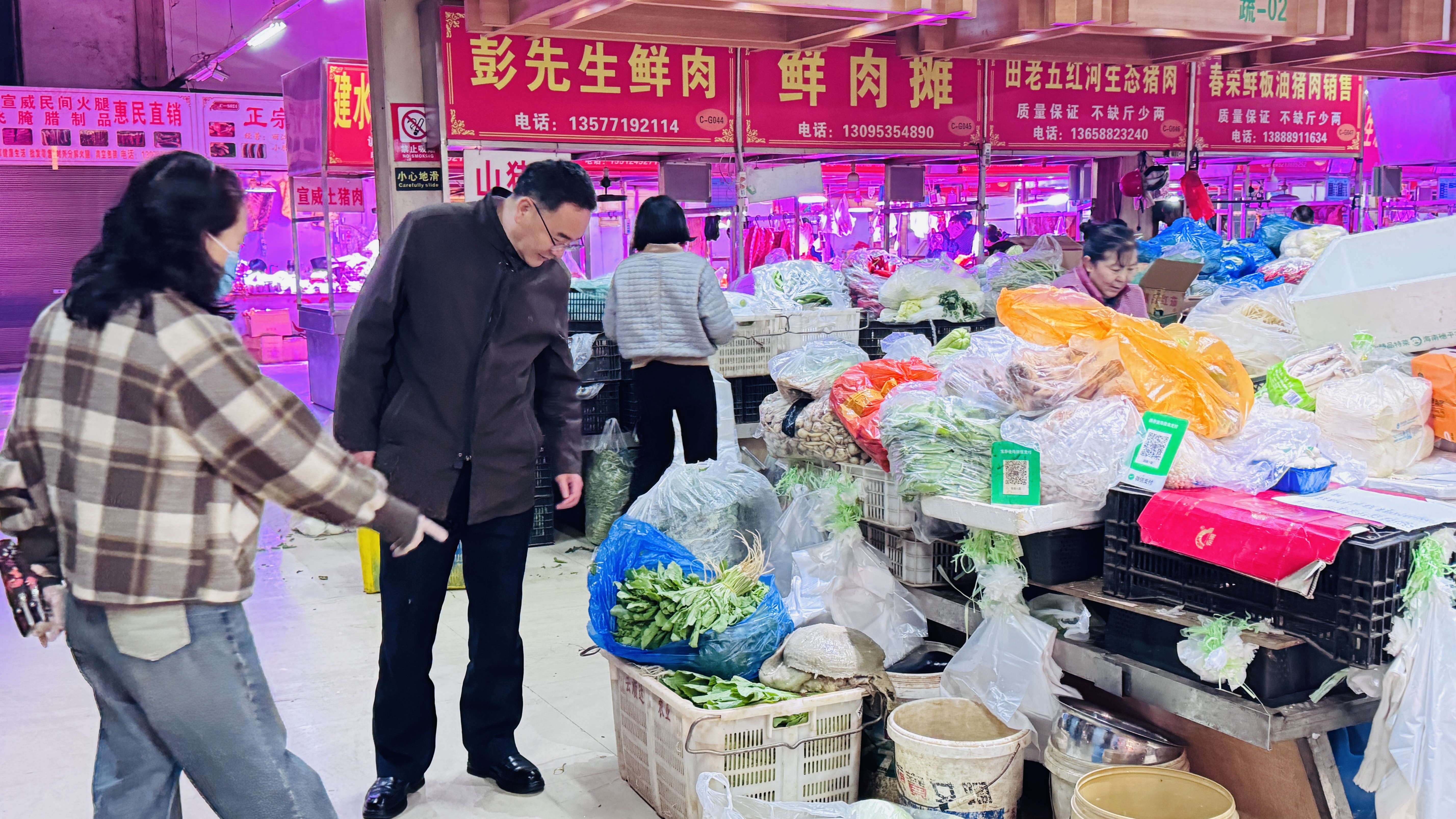 为有效掌握和控制食堂成本,确保食堂物资采购的合理性和安全性,后勤公司于12月31日组织了一次市场调研活动。总经理姚树明、副总经理杨俊芬、相关部门负责人及各餐厅经理组成调研小组,前往呈贡龙城农贸批发市场进行蔬菜、肉类、鱼类和海鲜的价格调研。