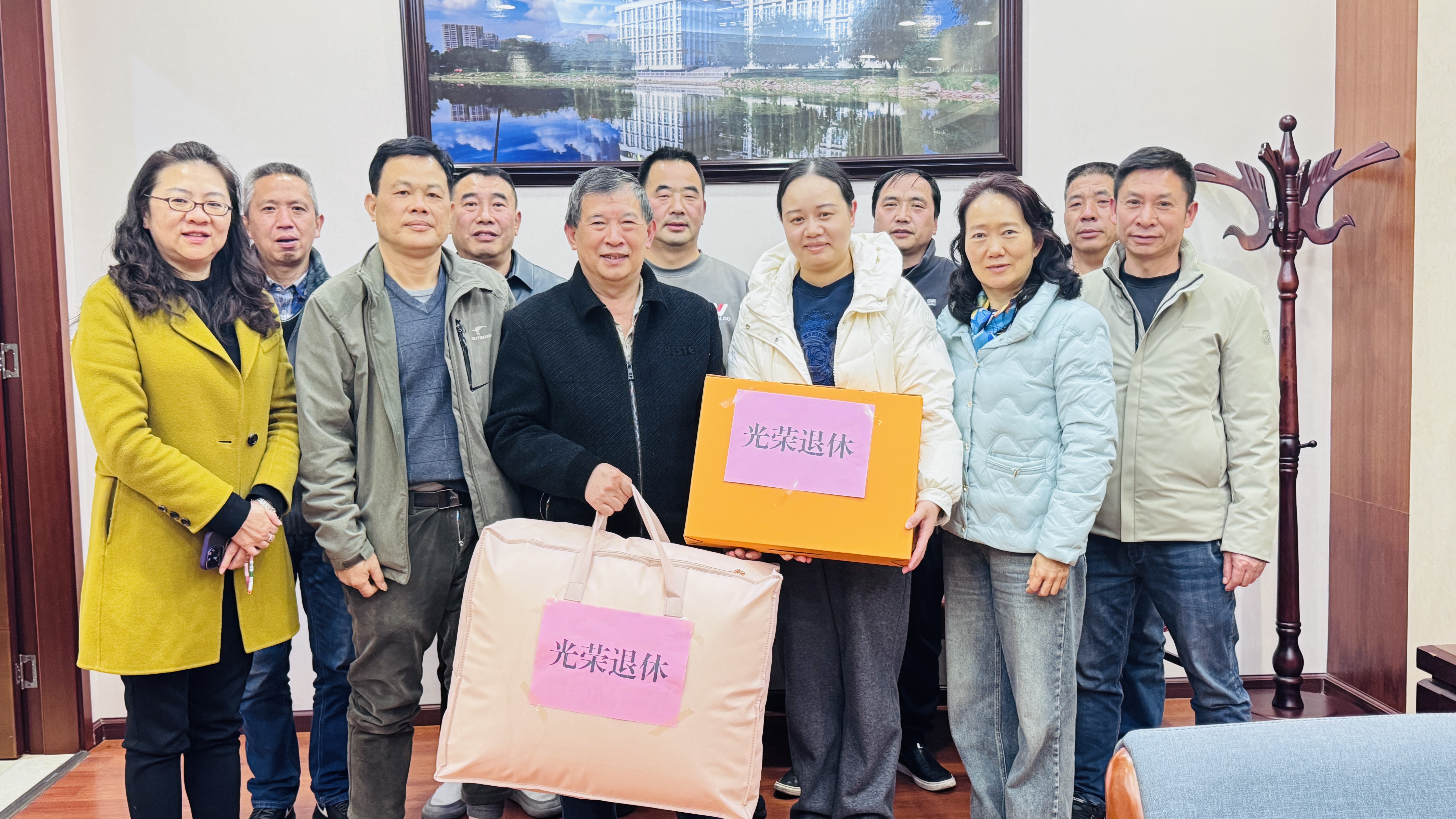 最后,公司为周光祥师傅颁发了“光荣退休”纪念品并合影留念。