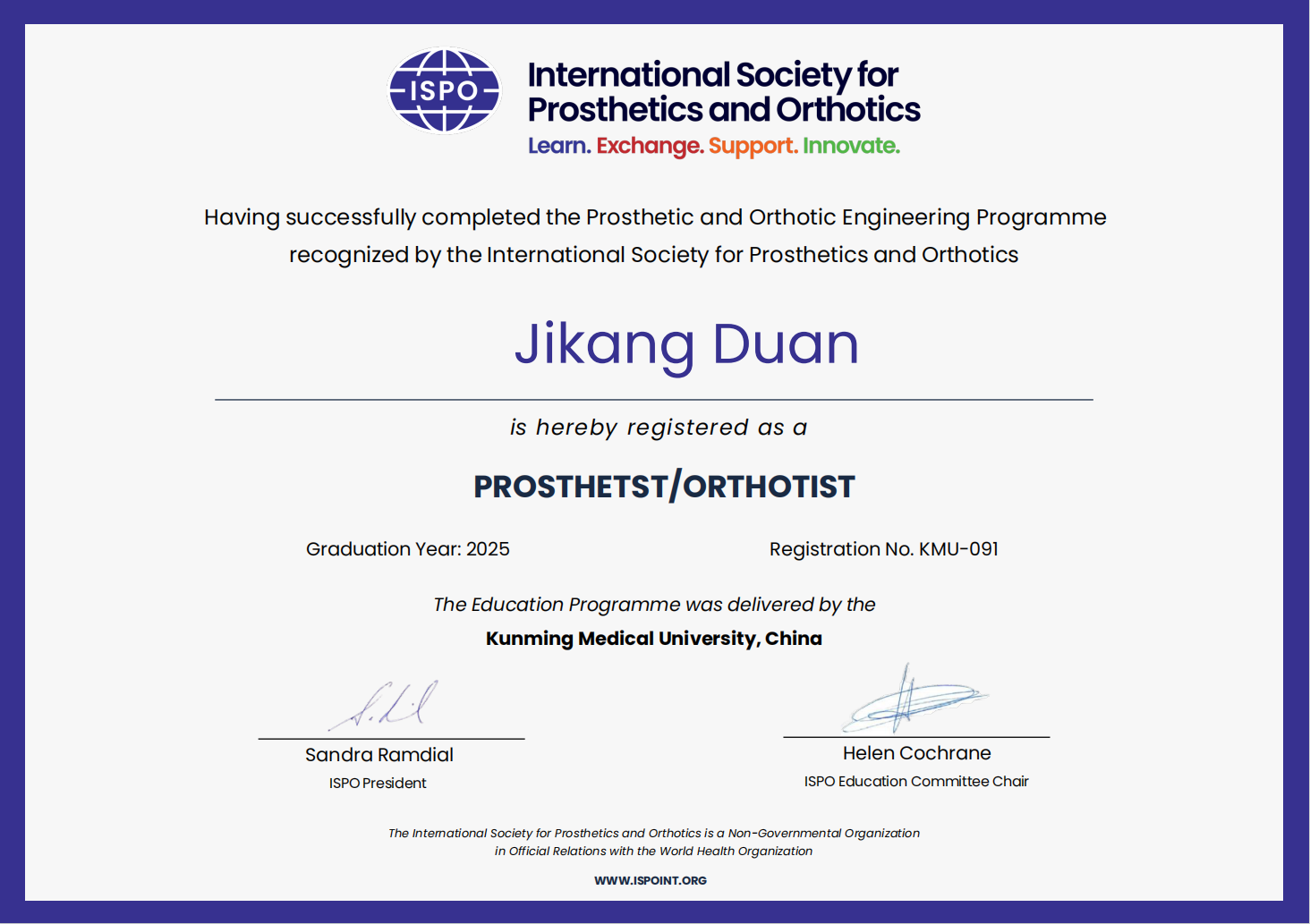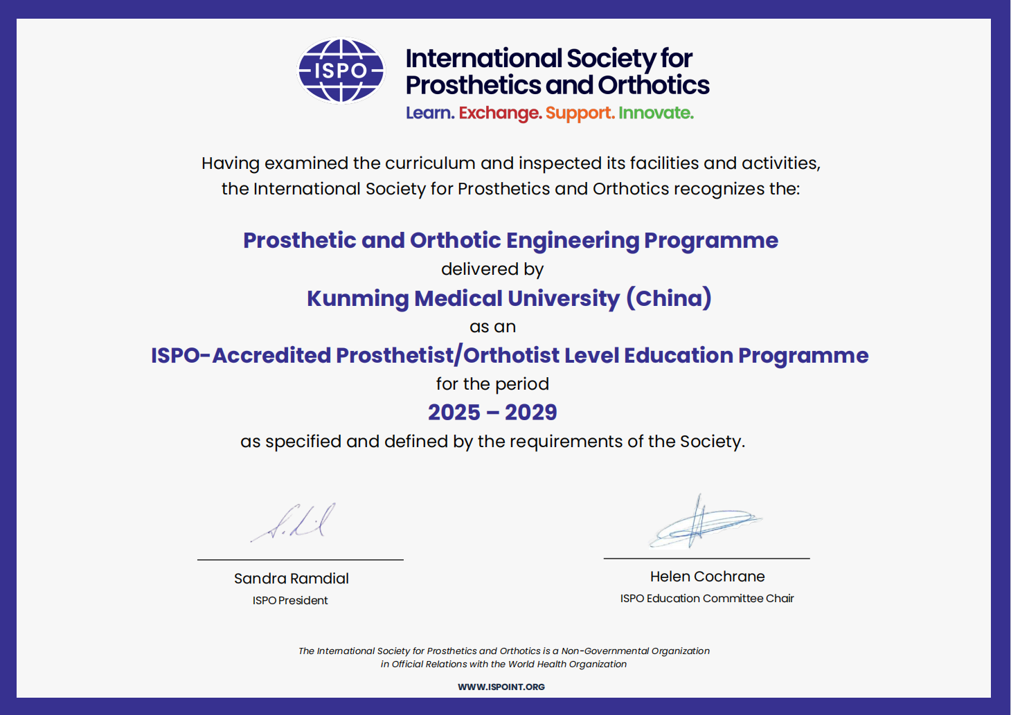 伟德国际1949官网于2018年开办假肢矫形工程专业,自开设之初就对标香港理工大学,建立了国际化的课程体系,始终以国际标准为引领,以培养具有全球视野、过硬本领、人文情怀和创新能力的假肢矫形工程人才为目标。本次通过ISPO第二轮国际认证,学校和专业的国际认可度得到进一步提升,更多毕业生获得跨国执业资格,为构建人类卫生健康共同体作出昆医贡献。