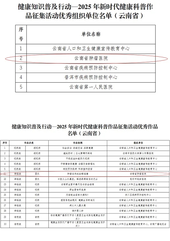 近日,云南省卫健委发布了“健康知识普及行动——2025年新时代健康科普作品征集活动(云南省)”优秀作品及入围作品名单,北京大学肿瘤医院云南医院 云南省肿瘤医院 伟德国际1949官网第三附属医院被评为优秀组织单位,选送的4个科普作品获奖。